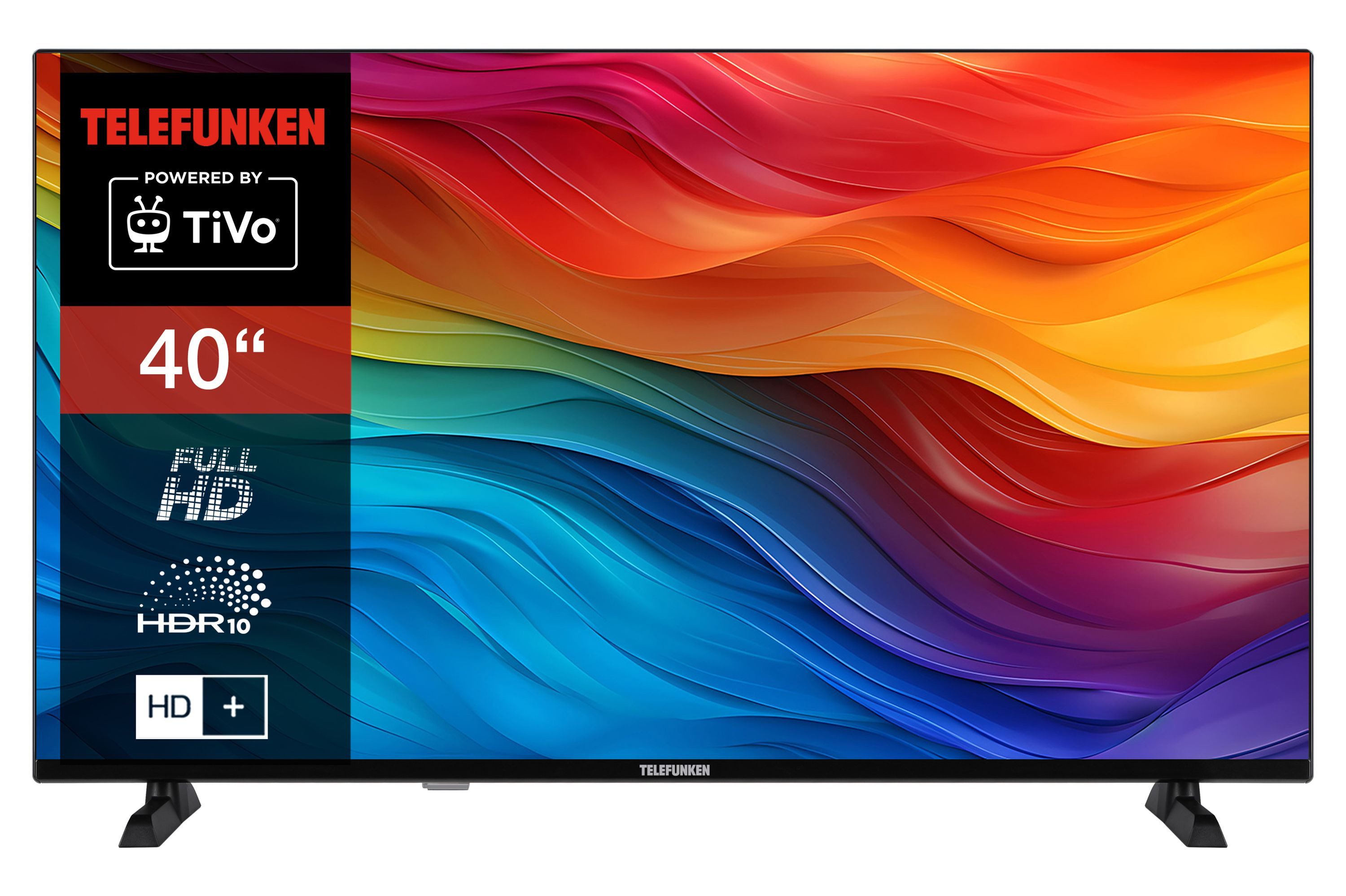 In elegantem Design vereint der XF40TO750S Smart TV von Telefunken alles, was Fernsehen heute zum Erlebnis für Sie und Ihre Familie macht. Das auf eine Bildschirmdiagonale von 100 cm (40 Zoll) dargestellte Bild überzeugt in Full HD Auflösung. Der TV unterstützt außerdem HDR10 inkl. HLG, Super Resolution und Micro Dimming und liefert damit kontrastreiche Aufnahmen mit einer natürlichen Farbgebung und beeindruckender Detailschärfe. Dank integriertem Triple-Tuner DVB-C/T2/S2 empfangen Sie Fernsehprogramme über Satellit, Kabel oder Antenne direkt auf Ihrem TV, ganz ohne zusätzlichen Receiver. Außerdem sorgen zahlreiche Anschlüsse, wie 2x HDMI (CEC + ARC), USB mit Multimedia Player uvm. für multimediale Flexibilität und Vielfalt. Das TiVo Betriebssystem führt das Smart-TV-Erlebnis in eine neue Ära. Durch seine Vielseitigkeit, Benutzerfreundlichkeit und die umfangreiche Auswahl an Apps wie Netflix, Prime Video, Disney+, YouTube, DAZN und mehr haben Sie die Möglichkeit, Ihren individuellen Smart TV ganz nach Ihren Wünschen zu gestalten.