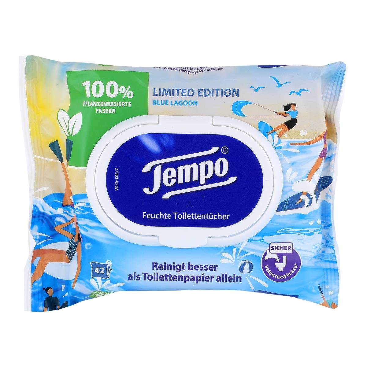 Im Lieferumfang enthalten: Tempo Feuchte Toilettentücher Blue Lagoon 42 TücherInhaltsstoffe | Aqua, Glycerin, Cocos Nucifera Oil, Prunus Amygdalus Dulcis Oil, Persea Gratissima Oil, Cetearyl Wheat Straw Glycosides, PEG-75 Shea Butter Glycerides, Cetearyl Alcohol, Tocopherol, Phenoxyethanol, Sodium Benzoate, , Potassium Sorbate, Citric Acid, Parfum, Sodium Citrate |
