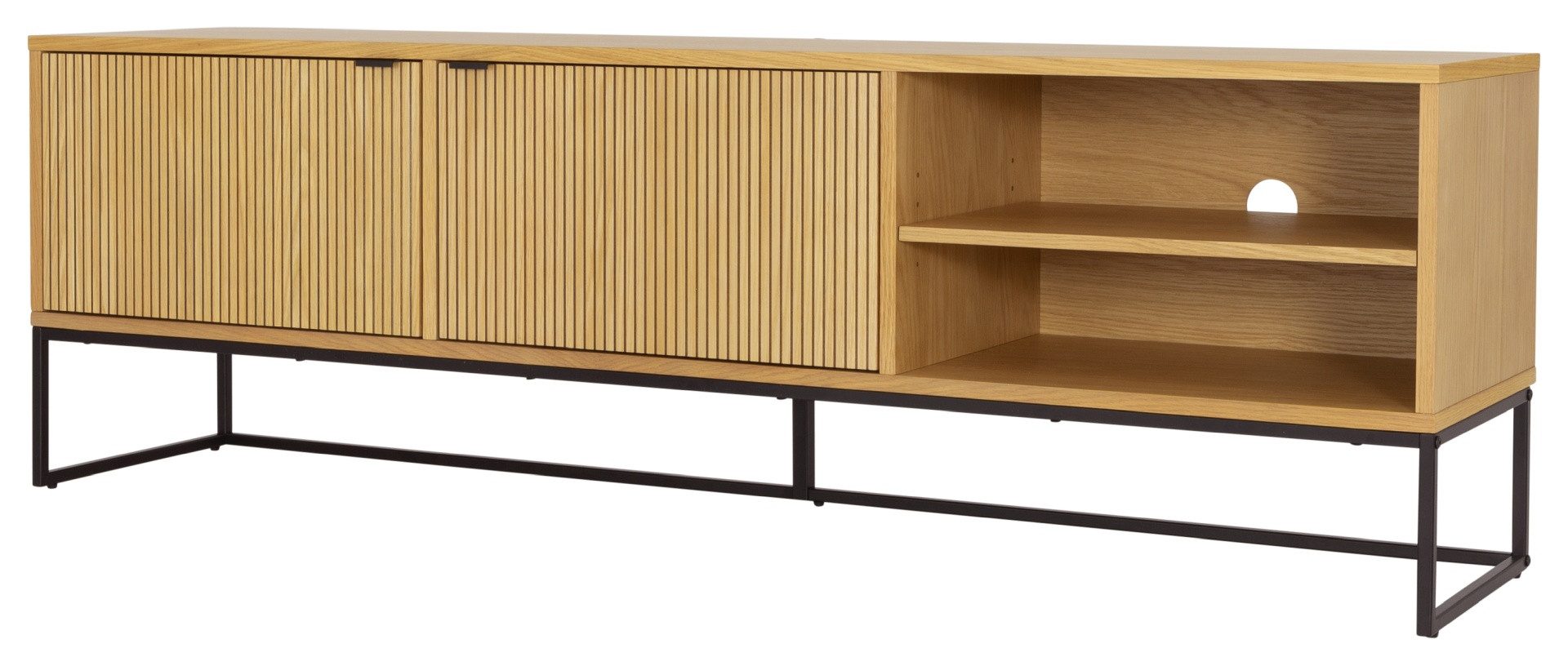 Mit seinen zwei Türen und den zwei offenen Fächern bietet das TV-Board reichlich Stauraum für technische Geräte, DVDs, Zeitschriften oder Deko-Elemente. Die großzügigen Maße von ca. 176 cm Breite, 40 cm Tiefe und 57 cm Höhe ermöglichen genug Platz für fast jedes TV-Gerät sowie zusätzliche Accessoires. Durchdachte Details wie ein praktischer Kabeldurchlass im hinteren Bereich erleichtern das Verstauen von Elektronik und sorgen für ein aufgeräumtes Gesamtbild.