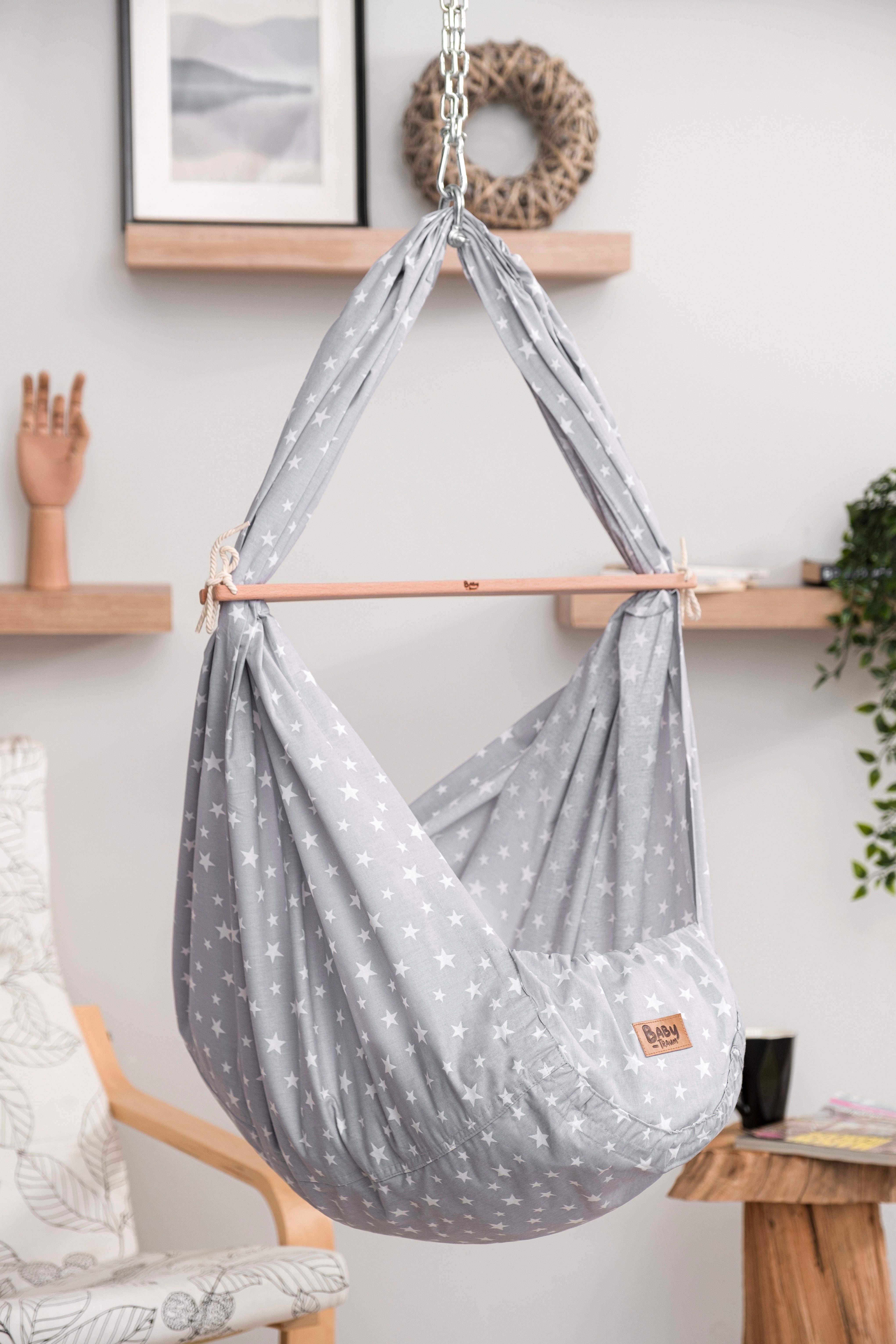 Lieferumfang: Wiegensack, Matratze, Tragetasche, Spezialfeder mit Sicherheitsseil, Spreizstab, Verlängerungskette (ca. 100 cm), Dübel, Ösenschraube, 2 Karabinerhaken, Montageanleitung mit Sicherheitshinweisen uvm.