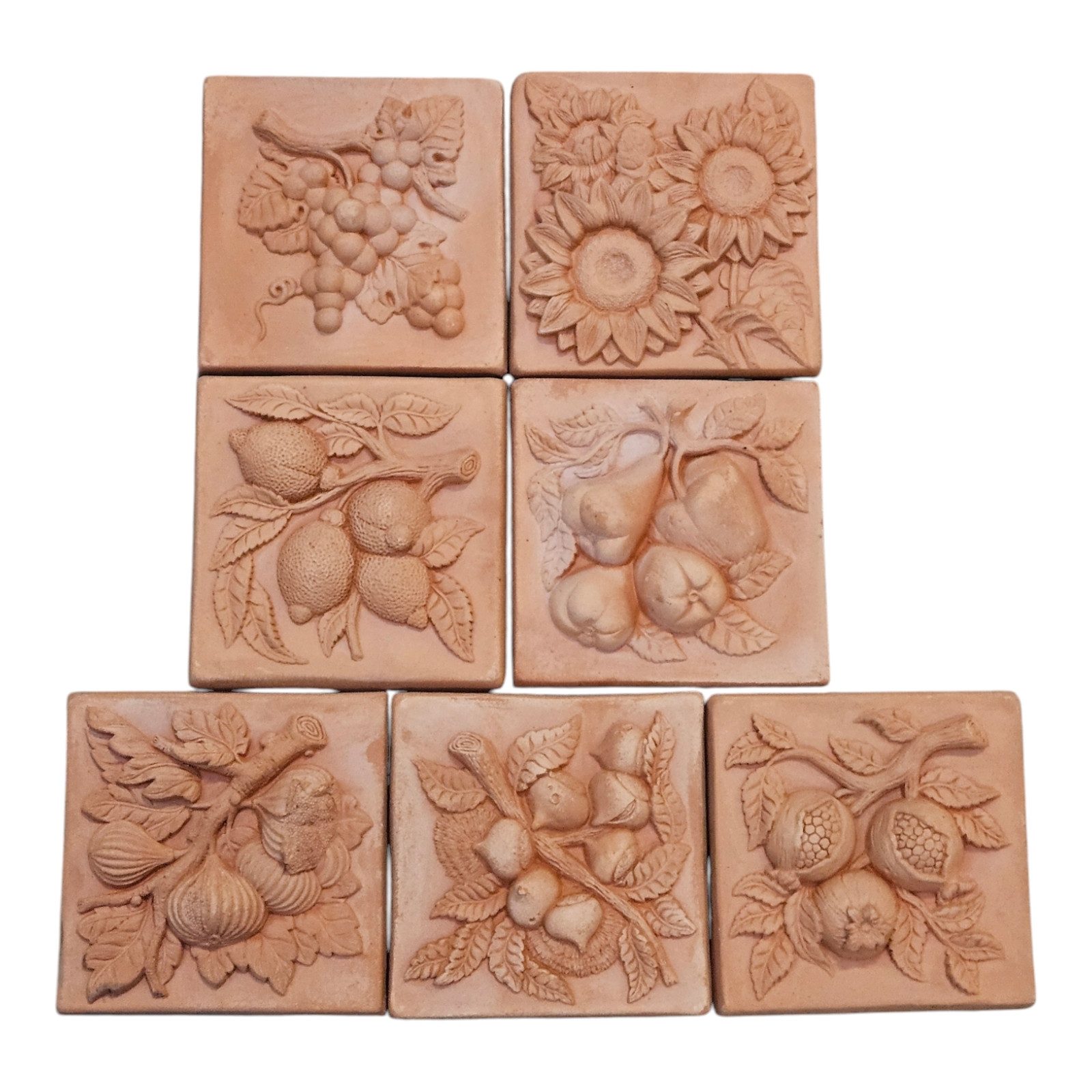 Einzigartige Motive: Jedes der 18x18cm großen Wandbilder zeigt ein detailreich gestaltetes Motiv aus der Welt der Früchte: Birnen, Weintrauben, Granatäpfel, Zitronen, Zwiebeln, Nüsse und Sonnenblumen. Die warmen Farben und die natürliche Patina des Terrakottas verleihen jedem Bild einen individuellen Charakter.