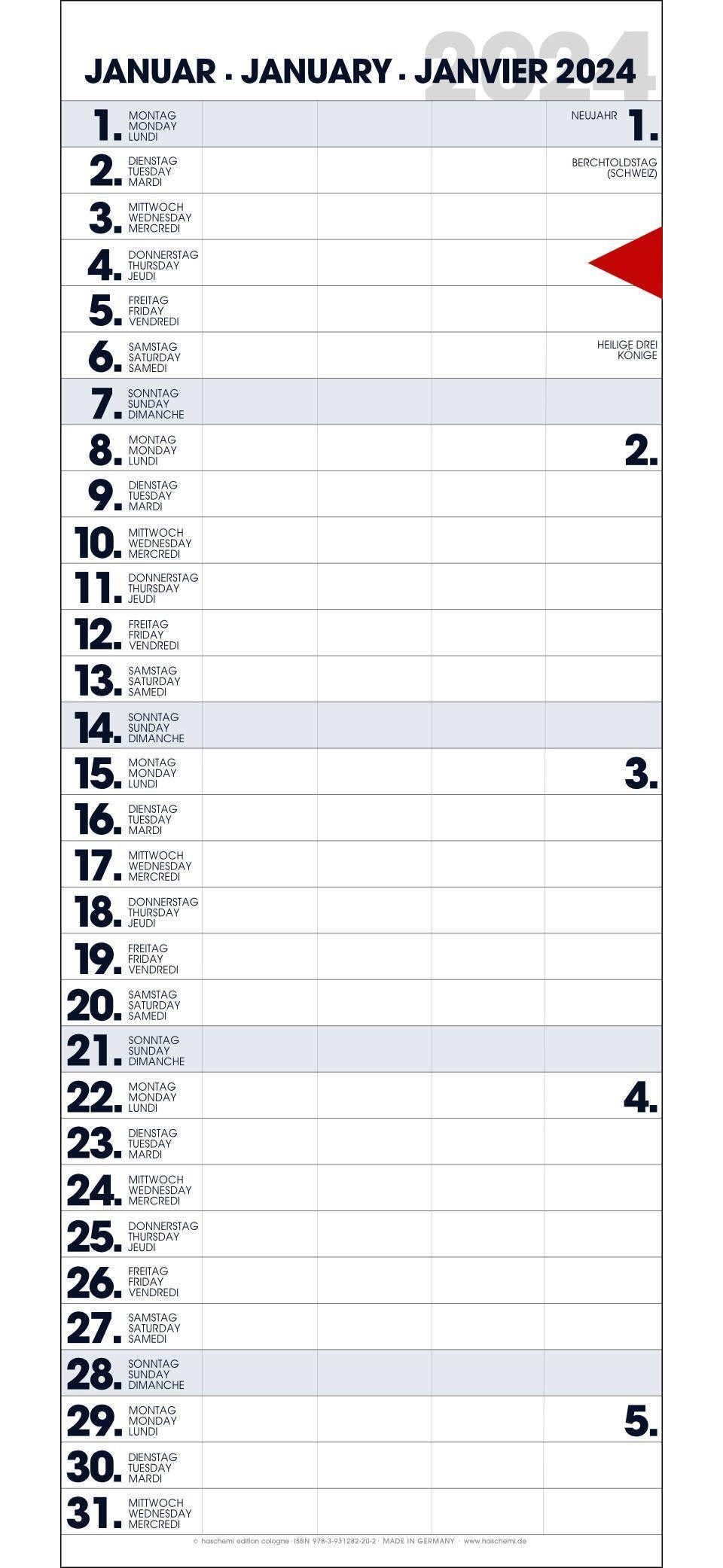 Ein sehr zweckmäßiger Streifenplaner - Familienplaner - Büroplaner - Küchenplnaer mit viel übersicht für Notizn. Der Planer für die Küche, das Arbeitszimmer oder für das Büro. Eintragungen aller Art, ob geschäftliche, private oder sonstige, können problemlos notiert werden. Werbeeindruck auf der Kopfleiste bis 4 Farben möglich. 12 Kalenderblätter, internationales Kalendarium, Wire-O-Bindung, Datumsclip, Format 20 x 50 cm