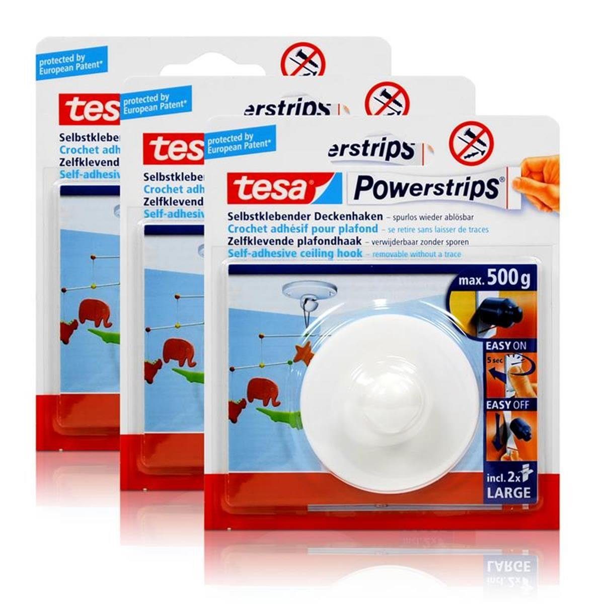 Der tesa Powerstrips® Deckenhaken zum Befestigen von Gegenständen und Dekorationen an der Zimmerdecke. Zur Befestigung dekorativer Gegenstände bis zu maximal 0,5 kg Gewicht, z.B. Mobiles Der Deckenhaken ist mit neuem tesa Powerstrips® Large mehrfach verwendbar Der drehbare Hakenkopf erlaubt das genaue Ausrichten der Objekte Der Powerstrip wird vom Deckenhaken vollständig verdeckt An nahezu allen Zimmerdecken anzuwenden Geeignet für: Kacheln, Glas, Holz und die meisten Kunststoffe Im Lieferumfang enthalten: 1x tesa Powerstrips Selbstklebender Deckenhaken - weiß für max. 500g Gewicht 3er Pack