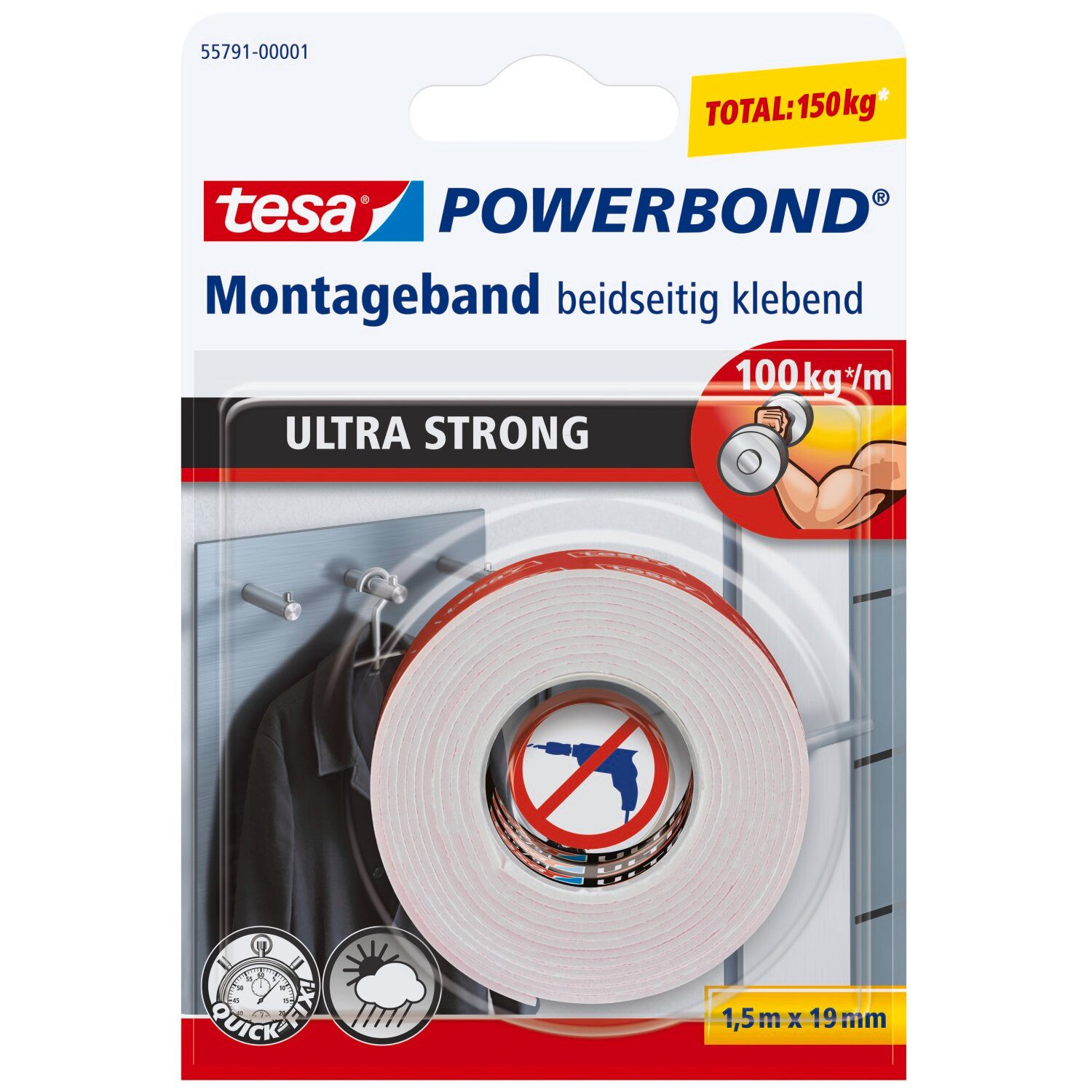 Ob Haushalt oder Büro - hin und wieder ist extrem starke Klebeleistung gefragt. In diesem Fall ist dieses leistungsstärkste der tesa Powerbond Produkte die richtige Lösung. Das auf beiden Seiten extra starke Montageband verfügt mit seiner Tragkraft von 10 kg per 10 cm über maximale Kraft. Es löst aufwendige, auf dem Untergrund Spuren hinterlassende Befestigungsmethoden ab: Bohren sowie die Aufhängung mit Dübeln, Schrauben und Nägeln sind damit obsolet.
