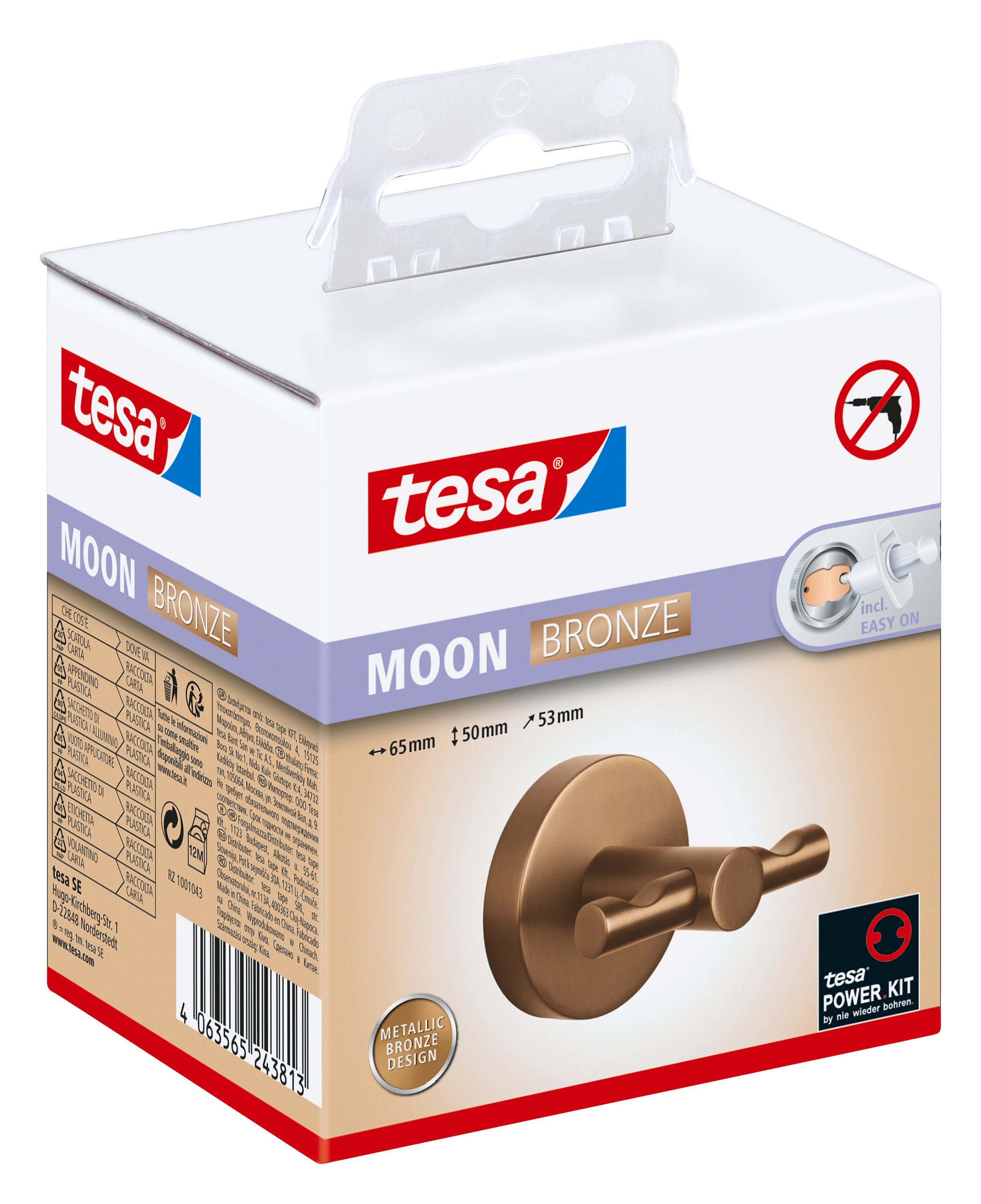tesa® MOON Bademantelhaken, in gebürsteter Bronze Nach einem Bad ist der kuschelige Bademantel sofort griffbereit. Dieser Badhaken ist ein geschmackvolles Detail fürs Badezimmer und verleiht Bademänteln endlich einen festen Platz. Mit der Design-Serie tesa MOON setzt man gekonnt Akzente im Badezimmer. tesa MOON bietet ein vielfältiges Меню an Bad-Zubehör aus kratzfestem, PVD-beschichtetem Metall. Mit ihrer zeitlosen Form fügen sich die tesa MOON Bad-Produkte stilvoll in vielen Badezimmertrends ein. Sie sind zudem langlebig und frei miteinander kombinierbar. Dank einer fortschrittlichen und zuverlässigen Klebelösung erfolgt die Montage ganz ohne Bohren. Wände und Fliesen werden so nicht beschädigt. Beim Entfernen bleiben keine Spuren auf der Oberfläche zurück. Einfach wiederverwendbar mit einem neuen, passenden Adapter. Anleitung: Die Oberfläche reinigen. Die Schutzfolie entfernen und den Adapter an der Wand befestigen. Anschließend den Kleber mit der Klebepistole einfüllen, 12 Stunden aushärten lassen und dann montieren. Der Adapter kann mit einer Rohrzange wieder abgeschraubt werden. Klebstoffreste gegebenenfalls mit einem Glasschaber entfernen. Achtung! Bei der Verwendung kann gefährlicher lungengängiger Staub entstehen. Staub nicht einatmen. tesa - mehr als ein Klebeband Das deutsche Unternehmen entwickelt seit über 125 Jahren Lösungen für vielfältige Anwendungen. tesa gehört zu den weltweit führenden Herstellern von Klebebändern und Klebesystemlösungen und steht für innovative und qualitativ hochwertige Produkte.