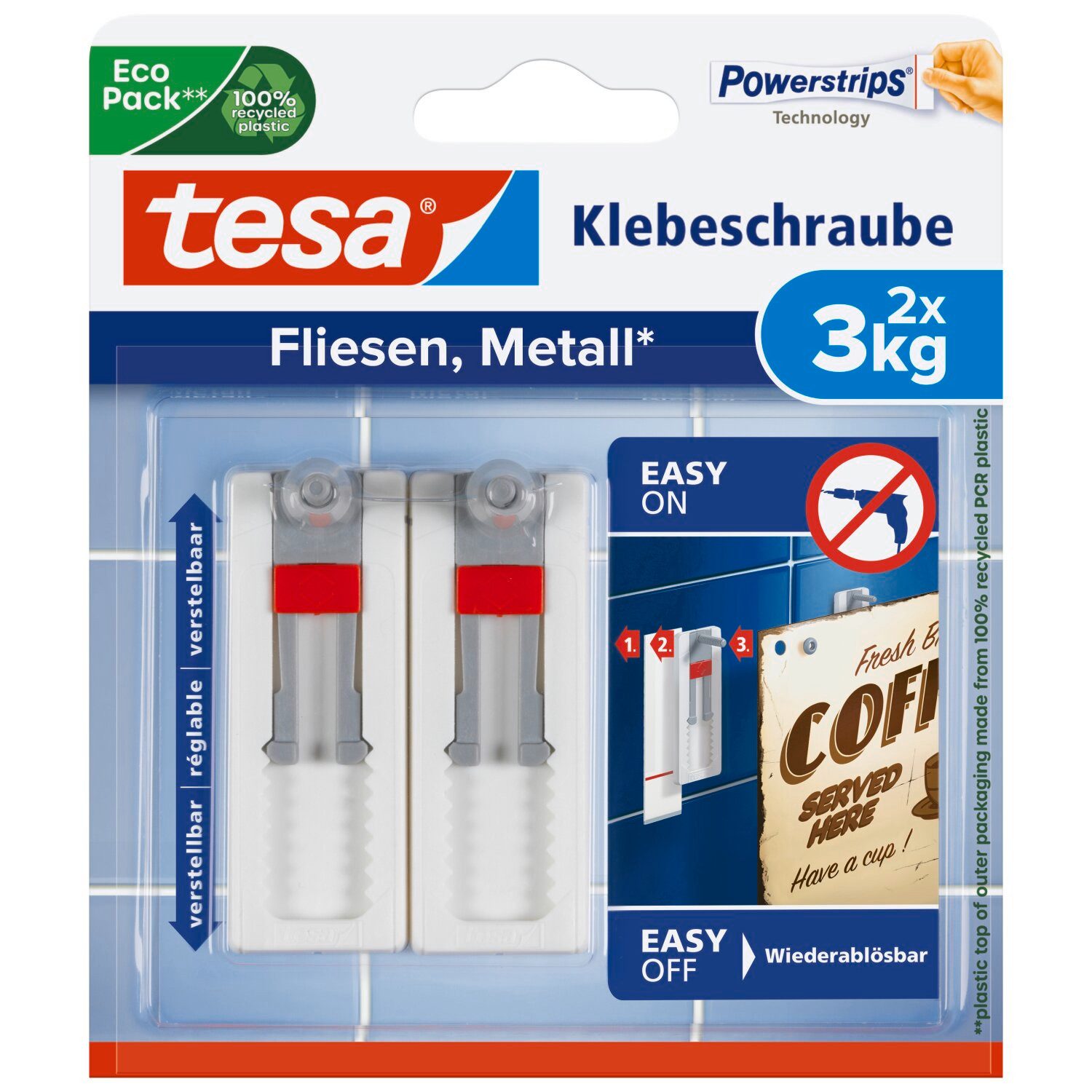 tesa Verstellbarer Klebenagel für Fliesen und Metall - ideal für Leinwand & Keilrahmen Die Klebenägel von tesa sind eine clevere Alternative zu Schrauben und herkömmlichen Nägeln. Anstatt zu bohren oder zu hämmern, kleben Sie den Nagel schnell und einfach an die Wand. Dort sorgt er dank der bewährten tesa Powerstrips Technologie für eine Halteleistung von bis zu 2kg (pro Klebenagel). Sie verursachen keine Schäden am Untergrund, können den Klebenagel jederzeit spurlos wieder entfernen und mit einem neuen Powerstrip sogar wiederverwenden. Diese Produktvariante des selbstklebenden Nagels eignet sich ideal zum sicheren Aufhängen von Leinwänden und Keilrahmen im Innenbereich. Die Metallspitze des Klebenagels sorgt für sicheren Halt der Leinwand. Der Nagel zum Kleben lässt sich nach der Wandmontage bequem in seiner Höhe verstellen. Sie müssen dafür einfach den Nagelkopf verschieben und mit dem Regler fixieren. Eine Neujustierung ist jederzeit möglich. EASY ON: Reinigen Sie die Oberfläche gründlich mit Fensterreiniger (ohne Silikon) oder Brennspiritus. Drücken Sie die Klebestreifen zunächst im oberen, dann im unteren Bereich für jeweils 5 Sekunden fest und gleichmäßig an die Wand. Pressen Sie den Nagel für минимум 5 Sekunden auf die Klebefläche (Reihenfolge: oben, mittig, unten). Achten Sie darauf, dass der Anfasser sichtbar bleibt. Hinweise: Klebestreifen erst auf der raueren Fläche anbringen. Klebeflächen nicht berühren. EASY OFF: Halten Sie den Klebenagel an der Seite fest, ohne ihn dabei an die Wand zu drücken. Greifen Sie den Strip am Anfasser und ziehen Sie ihn parallel zur Wand langsam ca. 35cm nach unten (nicht nach oben, nach vorne oder zur Seite). Hinweis: Nicht paralleles oder zu schnelles Abziehen könnte zum Reißen des Klebestreifens oder Schäden am Untergrund führen. INHALT PRO PACKUNG: 2 Klebenägel, 3 Powerstrips