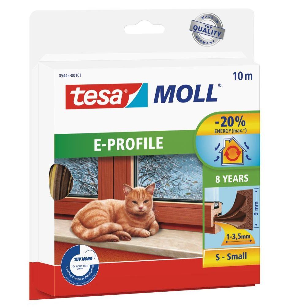 Mit der hochwertigen tesamoll® E-Profil Gummidichtung können Sie kleine Spalten in Fenstern und Türen abdichten und dadurch bis zu 20% Energie einsparen. Die Montage des Dichtungsstreifens ist ein echtes Kinderspiel. Sie müssen lediglich die Oberfläche gründlich reinigen und können dann die Gummidichtung anbringen. Außer einem Teppichmesser oder einer Schere benötigen Sie kein Werkzeug. Die Dichtung hat eine Mindestlebensdauer von acht Jahren und lässt sich nach dem Gebrauch problemlos wieder entfernen. Die Gummidichtung schützt nicht nur vor Zugluft, sondern auch vor Geräuschen und Gerüchen.