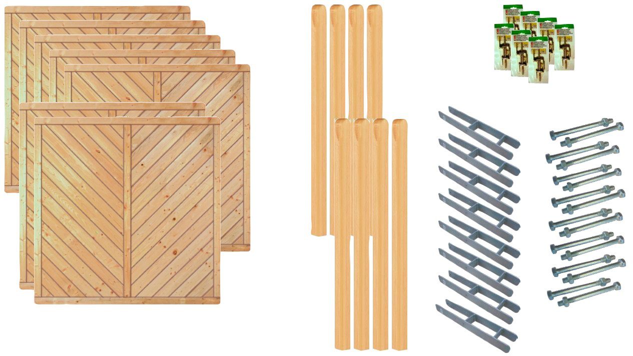 Lieferumfang | 7 Elemente 180x180 cm; 8 Pfosten 9x9x190 cm gerundet; 8 H-Pfostenträger, 7 Pakete L-Beschläge mit Schrauben; 8 Pakete Durchgangsschrauben. |