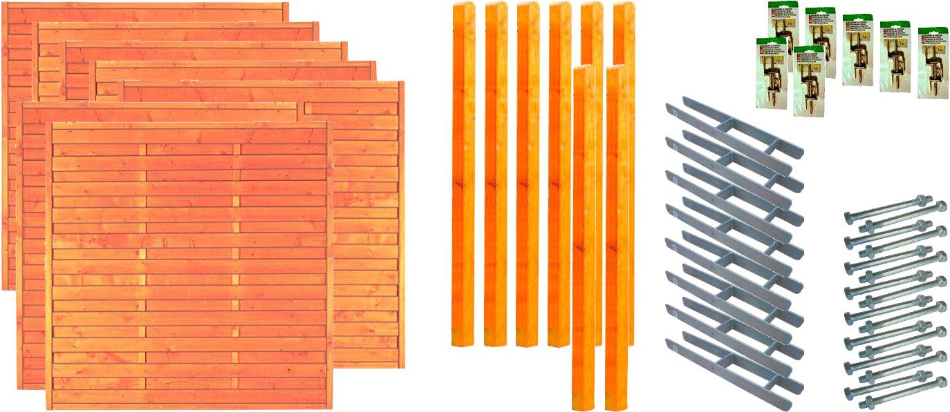 Lieferumfang | 7 Elemente 180x180 cm; 8 Pfosten 9x9x190 cm gerundet; 8 H-Pfostenträger, 7 Pakete L-Beschläge mit Schrauben; 8 Pakete Durchgangsschrauben. |