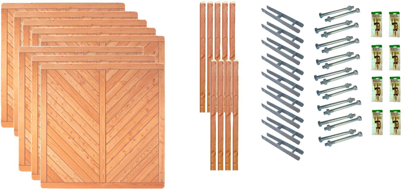 Lieferumfang | 8 Elemente 180x180 cm; 9 Pfosten 9x9x190 cm gerundet; 9 H-Pfostenträger, 8 Pakete L-Beschläge mit Schrauben; 9 Pakete Durchgangsschrauben. |