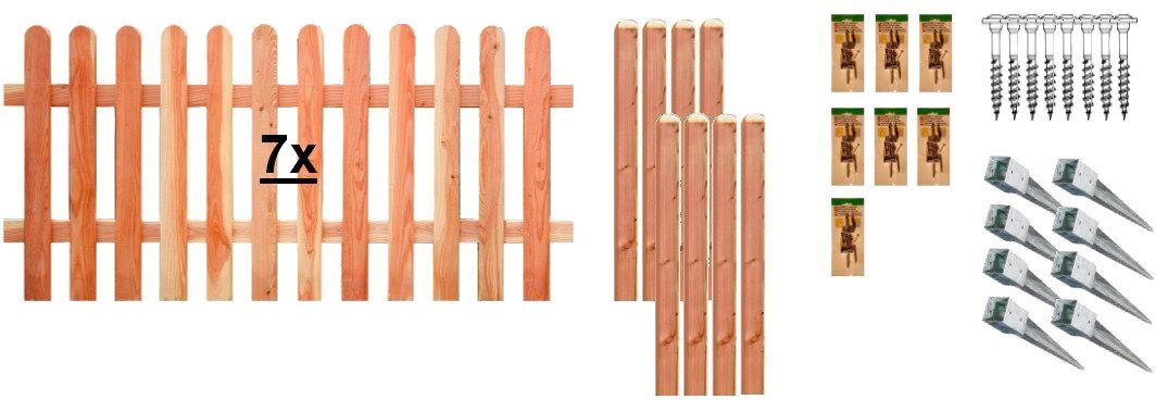 Lieferumfang | 7 Elemente 180x80 cm; 8 Pfosten 9x9x100 cm Kopf gerundet; 8 Einschlaghülsen, 7 Pakete L-Beschläge mit Schrauben; 8 Pakete Schrauben für Bodenhülsen. |