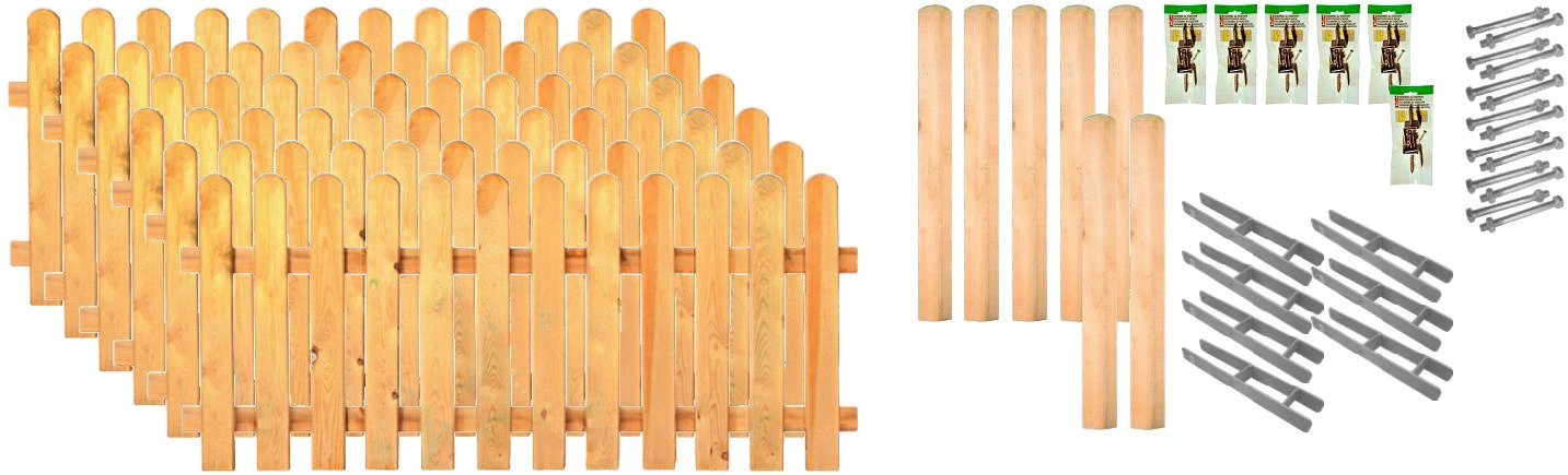 Lieferumfang | 6 Elemente 180x80 cm; 7 Pfosten 9x9x110 cm Kopf Bischofsmütze; 7 H-Pfostenträger, 6 Pakete L-Beschläge mit Schrauben; 7 Pakete Durchgangsschrauben. |