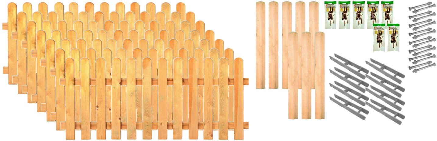 Lieferumfang | 7 Elemente 180x80 cm; 8 Pfosten 9x9x110 cm Kopf Bischofsmütze; 8 H-Pfostenträger, 7 Pakete L-Beschläge mit Schrauben; 8 Pakete Durchgangsschrauben. |
