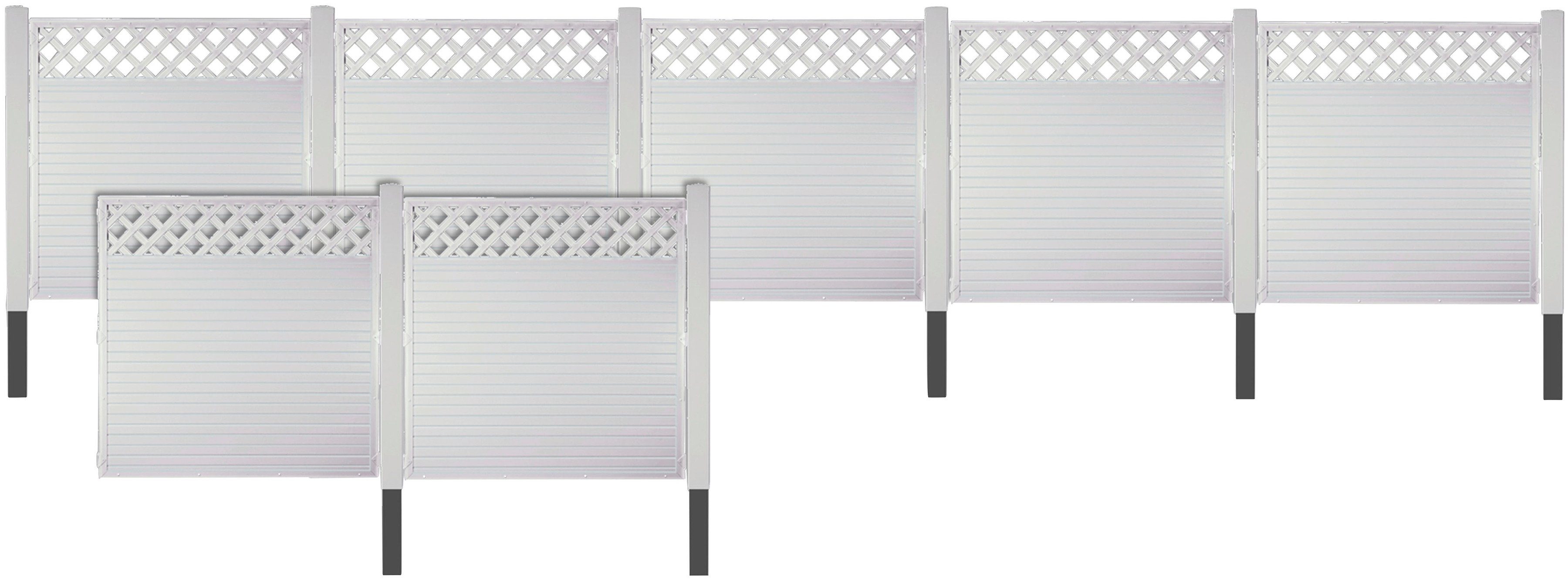 Lieferumfang | 7 Kunststoff-Sichtschutzelemente mit Rankgitter 180 x 180 cm inkl. Halter 8 Pfosten 9 x 9 x 240 cm inkl. Abdeckkappe Pyramide |