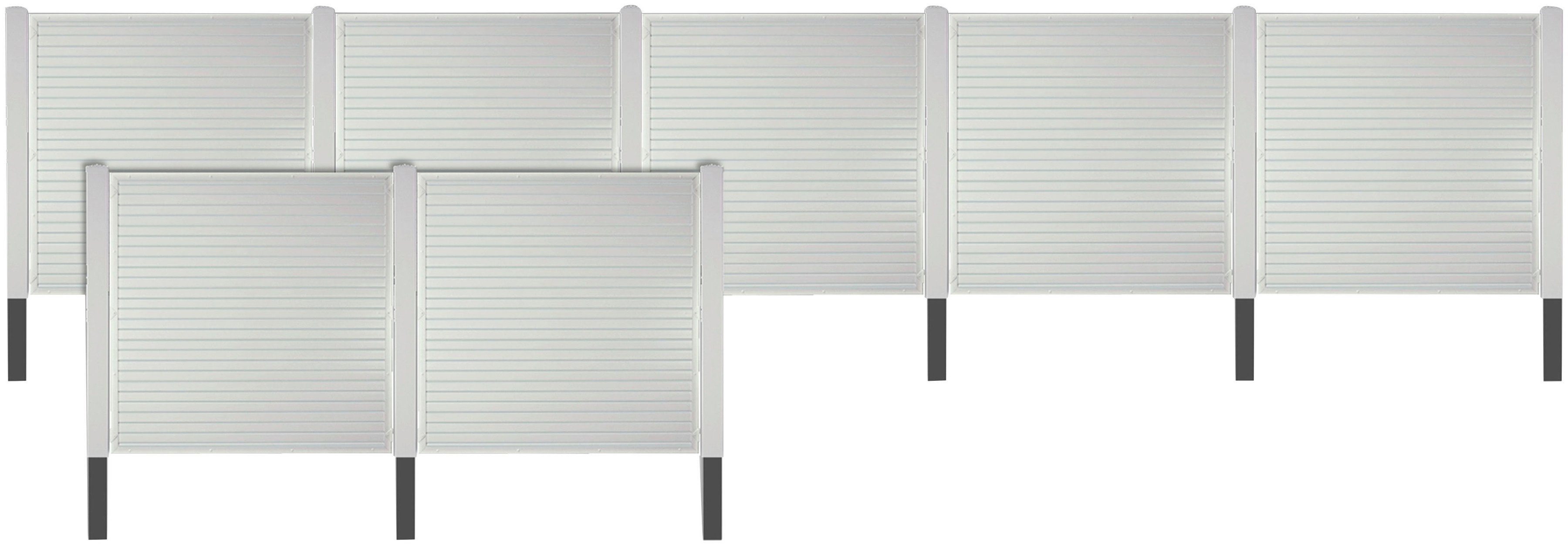 Lieferumfang | 7 Kunststoff-Sichtschutzelemente 180 x 180 cm inkl. Halter 8 Pfosten 9 x 9 x 240 cm inkl. Abdeckkappe Pyramide |