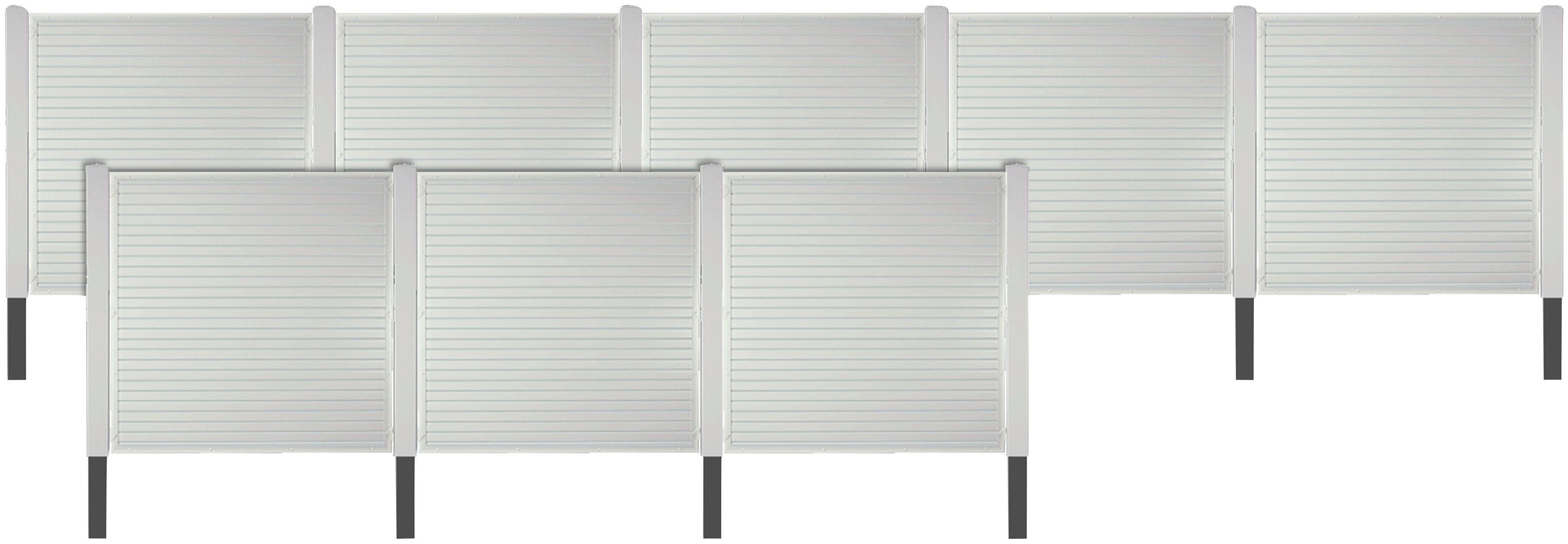 Lieferumfang | 8 Kunststoff-Sichtschutzelemente 180 x 180 cm inkl. Halter 9 Pfosten 9 x 9 x 240 cm inkl. Abdeckkappe Pyramide |