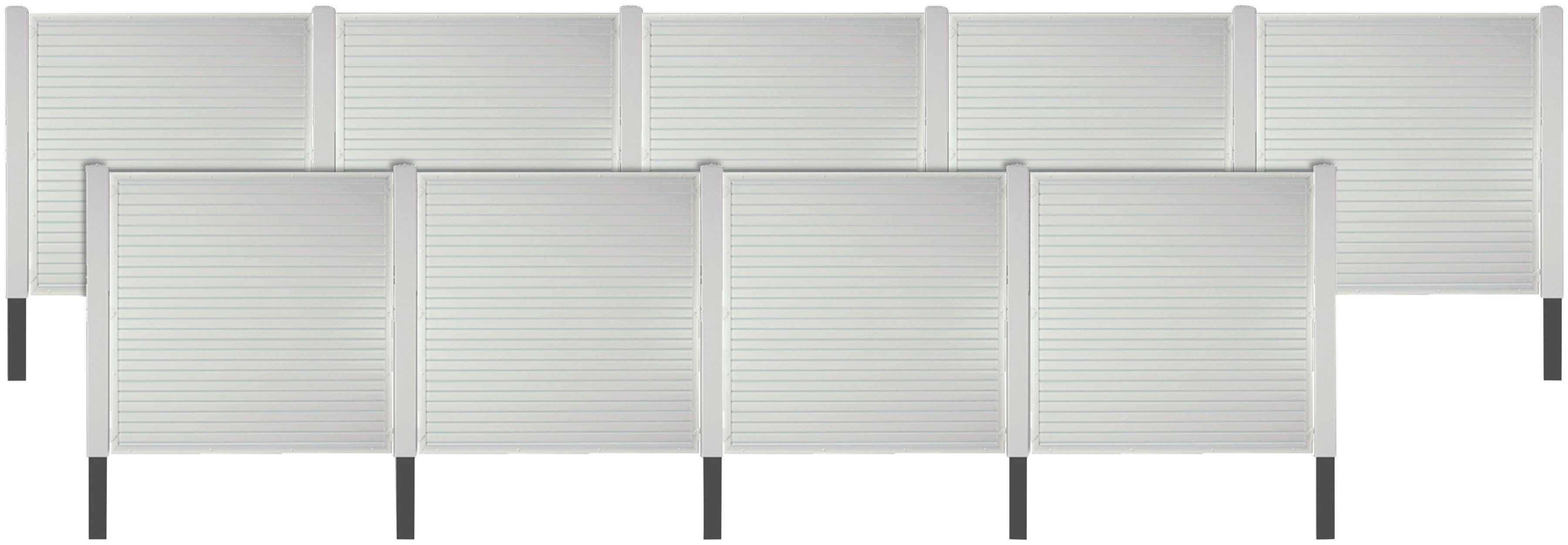 Lieferumfang | 10 Pfosten 9 x 9 x 240 cm inkl. Abdeckkappe Pyramide 9 Kunststoff-Sichtschutzelemente 180 x 180 cm inkl. Halter |