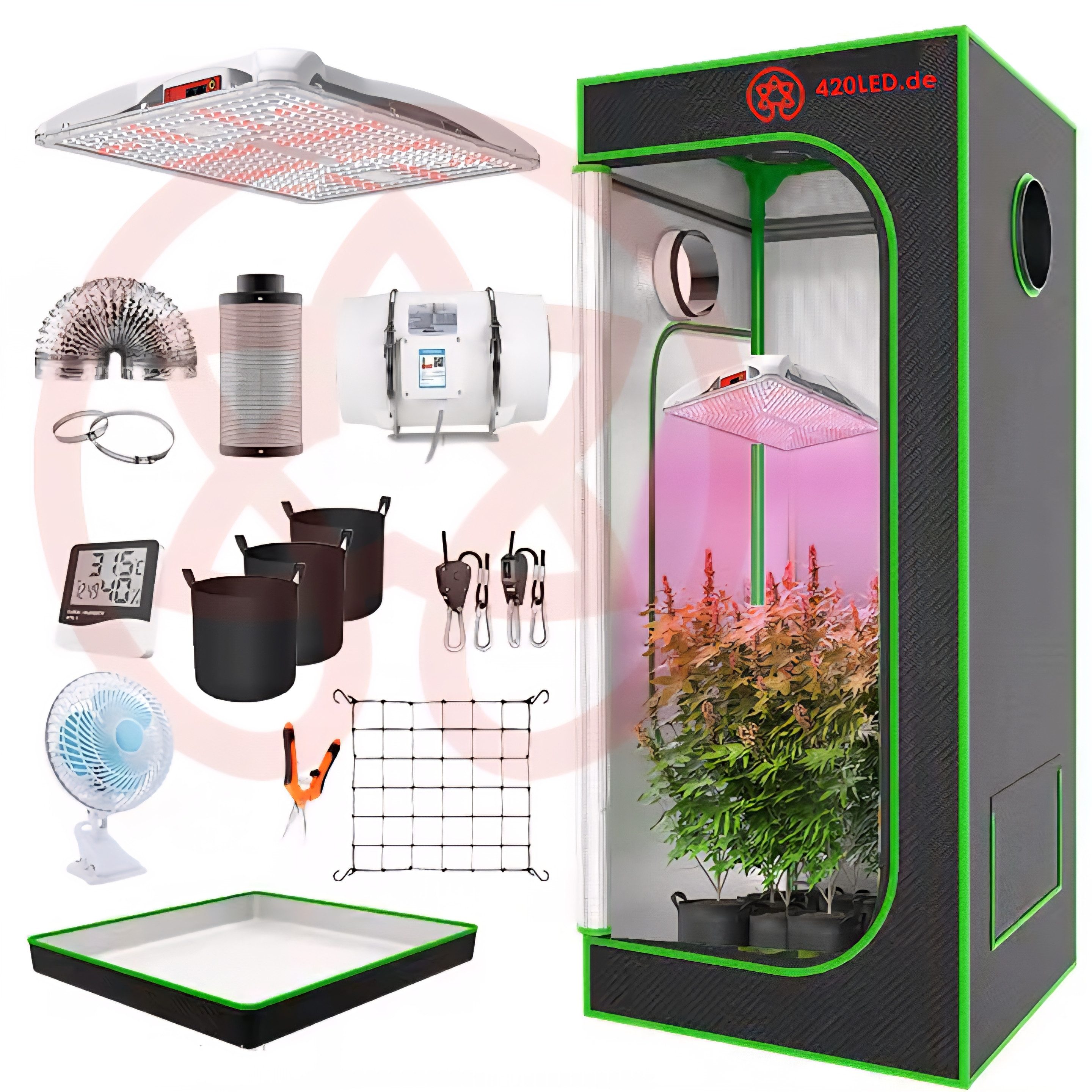 420LED® TIPI GROWBOX KOMPLETTSET – All-in-One Indoor-Paket für gesundes Pflanzenwachstum Mit dem 420LED® TIPI Growbox Komplettset erhältst du alles, was du für den erfolgreichen Einstieg in die Indoor-Aufzucht brauchst – perfekt abgestimmt, sofort einsatzbereit und in bewährter Markenqualität. Das Herzstück des Sets ist das hochwertige TIPI Growzelt (80×80×180 cm) mit Sichtfenster und reflektierender Innenfolie. Ergänzt wird es durch leistungsstarke LED-Beleuchtung, effiziente Luftfilterung und praktisches Zubehör – alles, was du brauchst, um direkt loszulegen. Set-Inhalt im Überblick: TIPI Growzelt – 80 × 80 × 180 cm Optimale Raumhöhe für dein Indoor-Growprojekt – lichtdicht, robust und mit Sichtfenster für einfache Kontrolle. Die reflektierende Innenbeschichtung verstärkt die Lichtausbeute für gesunden Pflanzenwuchs. 420LED® CISSY Grow Lampe – 200 Watt Besonders wichtig: High-End Beleuchtung mit starker Effizienz: 2,5 µmol/J für kraftvolles Wachstum. Mit 500 µmol/s Lichtstrom versorgst du deine Pflanzen zuverlässig vom Keimling bis zur Blüte. Aktivkohlefilter Keine störenden Gerüche – der Filter arbeitet geräuscharm und sorgt für diskrete Frische rund um dein Zelt. Duct Fan (Rohrventilator) Power in kompakter Form: Dieser Lüfter bringt effektiv Luft aus dem Zelt und verhindert Stauhitze. Aluminium Lüftungsschlauch Flexibel verlegbar, hitzeresistent und leicht zu installieren – die ideale Luftführung mit Profi-Flair. Schlauchschellen Klein, aber wichtig: Sichere Verbindungspunkte für deine Lüftung – stabil & rostfrei für dauerhaften Halt. Clip-Ventilator Sanfter Luftstrom für ein gleichmäßiges Mikroklima – deine Pflanzen atmen auf! Hydro- & Thermometer Volle Kontrolle über Luftfeuchtigkeit & Temperatur – für ein gesundes Pflanzenklima von Anfang bis Ende. 3 × 11 L Pflanztöpfe Perfekte Размер für mittlere bis große Pflanzen – optimal für Wurzelentwicklung. Scrog-Netz Für gleichmäßiges Wachstum und maximale Lichtverteilung – steigert den Ertrag sichtbar. ✂ Gartenschere Feinschnitt für feine Ergebnisse – ideal für Trimming und Pflege der Pflanzen. Netzstecker & Verbindungskabel Plug-and-grow: Sichere Stromzufuhr und einfache Montage aller Komponenten. Warum das TIPI Komplettset von 420LED®? Ideal für Einsteiger & Fortgeschrittene Sofort einsatzbereit – kein Zubehör extra kaufen Optimale Licht- & Klimabedingungen für gesunde Pflanzen Energieeffizient dank moderner LED-Technik Kompakt & leise – perfekt für Wohnung oder Keller