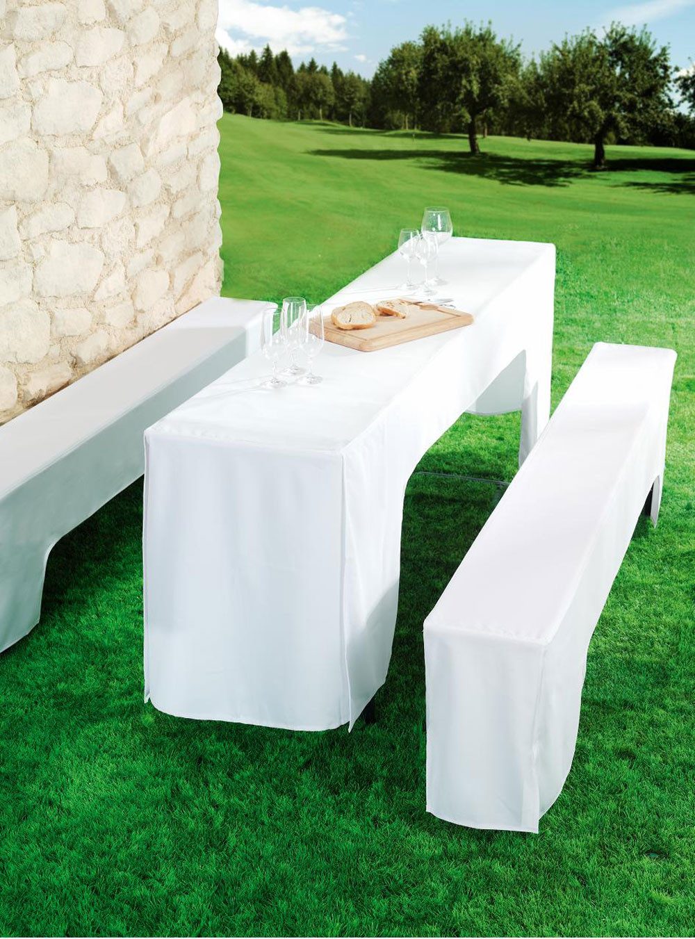 Dieses Set besteht aus einer Tischhusse und zwei Bankhussen, die aus 100% Polyester gefertigt sind.