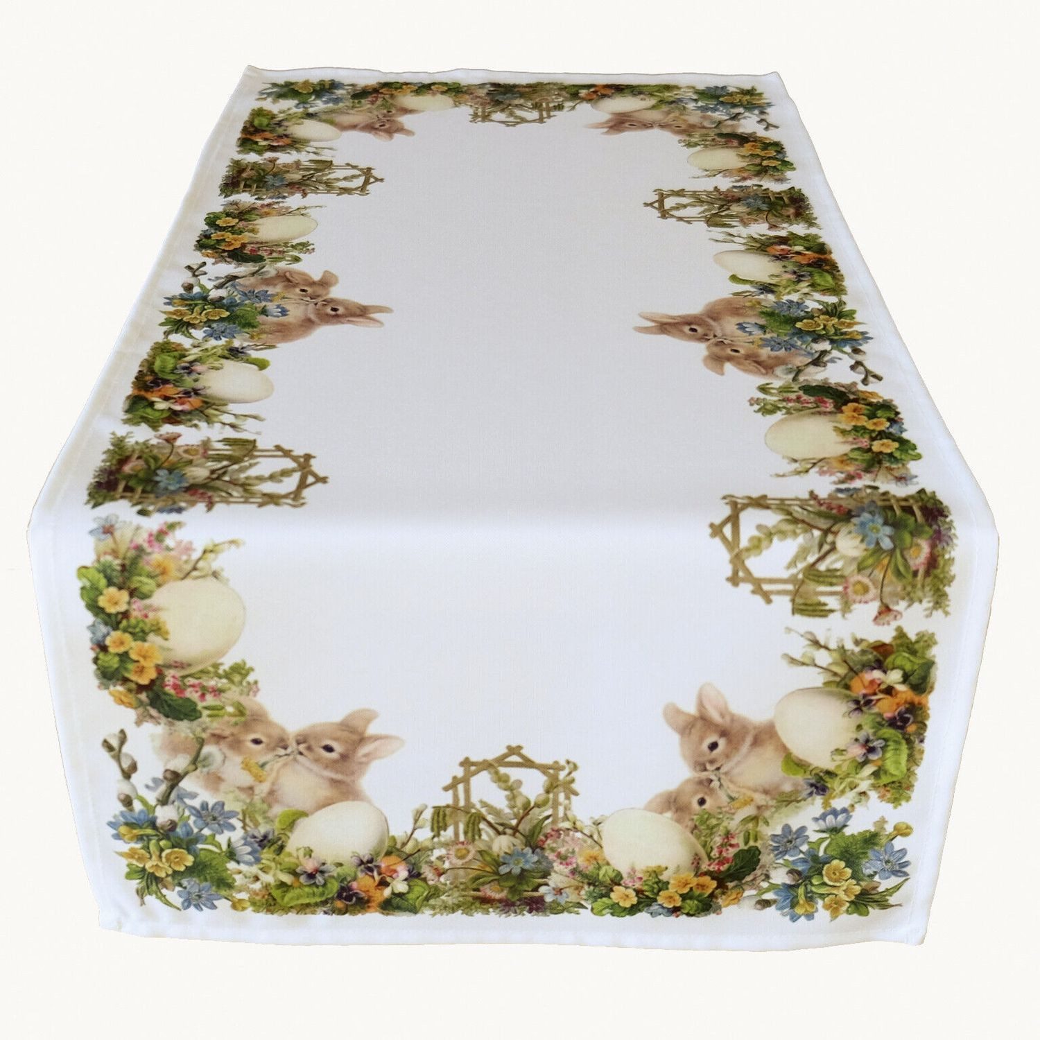 Bringen Sie fröhliche Osterstimmung in Ihr Zuhause mit dieser bezaubernden Tischdecke, die ein liebevolles Druckmotiv von einem Osterhasen und bunten Blumen auf weißem Grund zeigt.