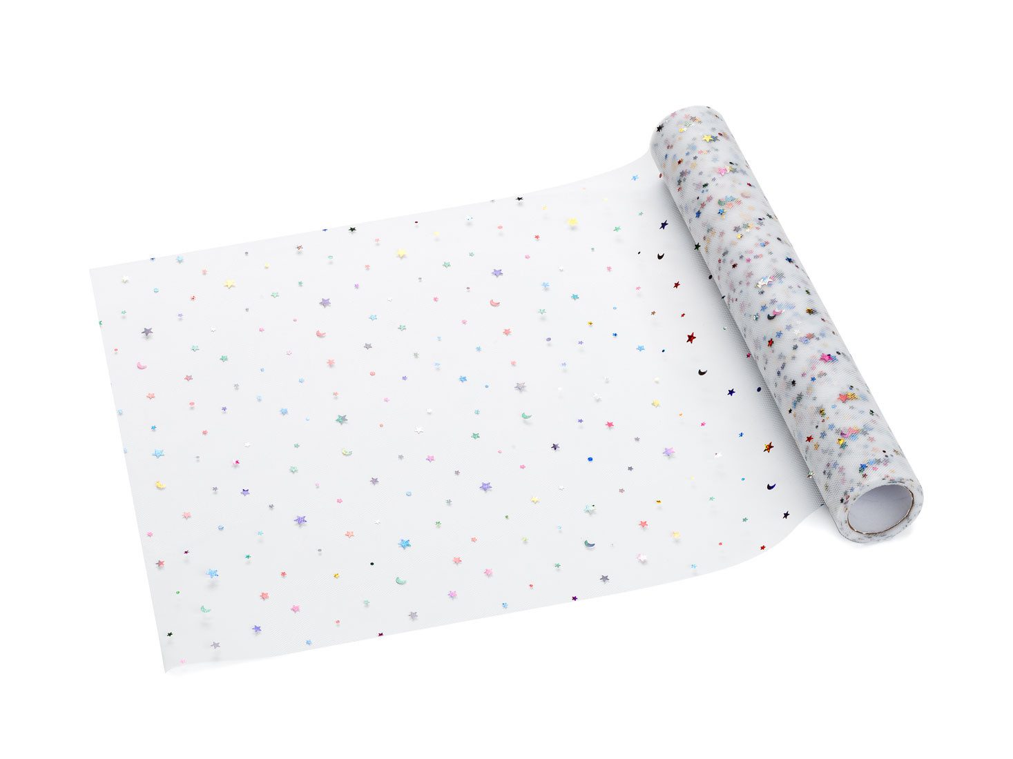 Der Netzläufer mit Sternen auf weißem Grund aus 100% Polyester verleiht Ihrer Tischdekoration eine romantische und elegante Note.