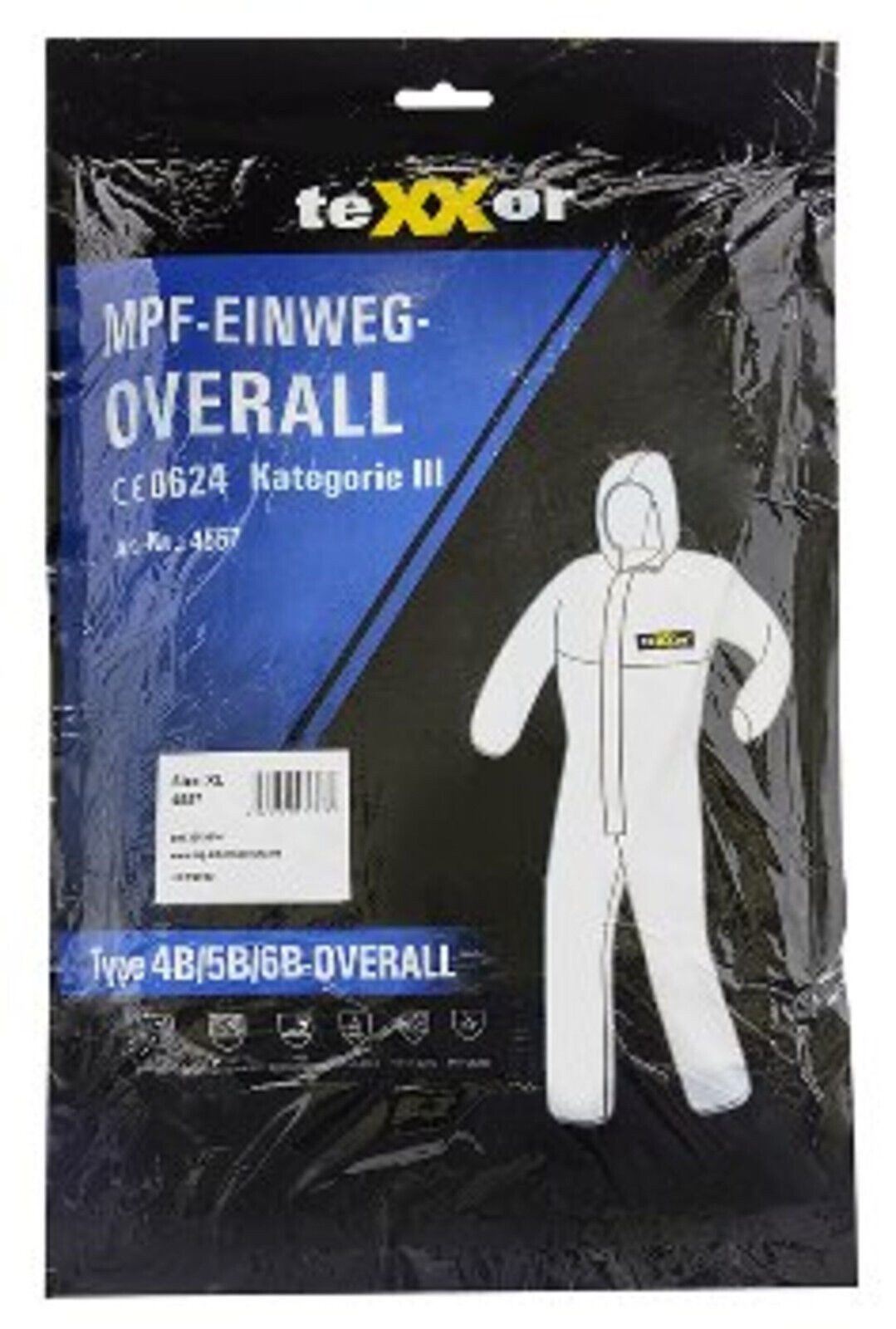 er 4357 Einweg-Overall der Marke Texxor bietet optimalen Schutz und höchsten Tragekomfort für vielseitige Anwendungen. Aus einem leichten Mikroporösen Film gefertigt, überzeugt der Overall durch sein geringes Gewicht von nur 65 g/m², was ihn besonders angenehm zu tragen macht. Die elastischen Bündchen an der Kapuze, den Armen, Knöcheln und in der Taille sorgen für eine perfekte Passform und verhindern das Eindringen von Staub und Flüssigkeiten. Der praktische Reißverschluss auf der Vorderseite ermöglicht ein einfaches An- und Ausziehen. In einem klassischen Weiß gehalten, eignet sich der Overall ideal für den Einsatz in der Industrie, im Gesundheitswesen oder bei Reinigungsarbeiten. Jeder Overall ist einzeln im Polybeutel verpackt, was nicht nur für eine hygienische Aufbewahrung sorgt, sondern auch die praktische Handhabung erleichtert. Vertrauen Sie auf Texxor, um sich und Ihre Kleidung bestmöglich zu schützen.