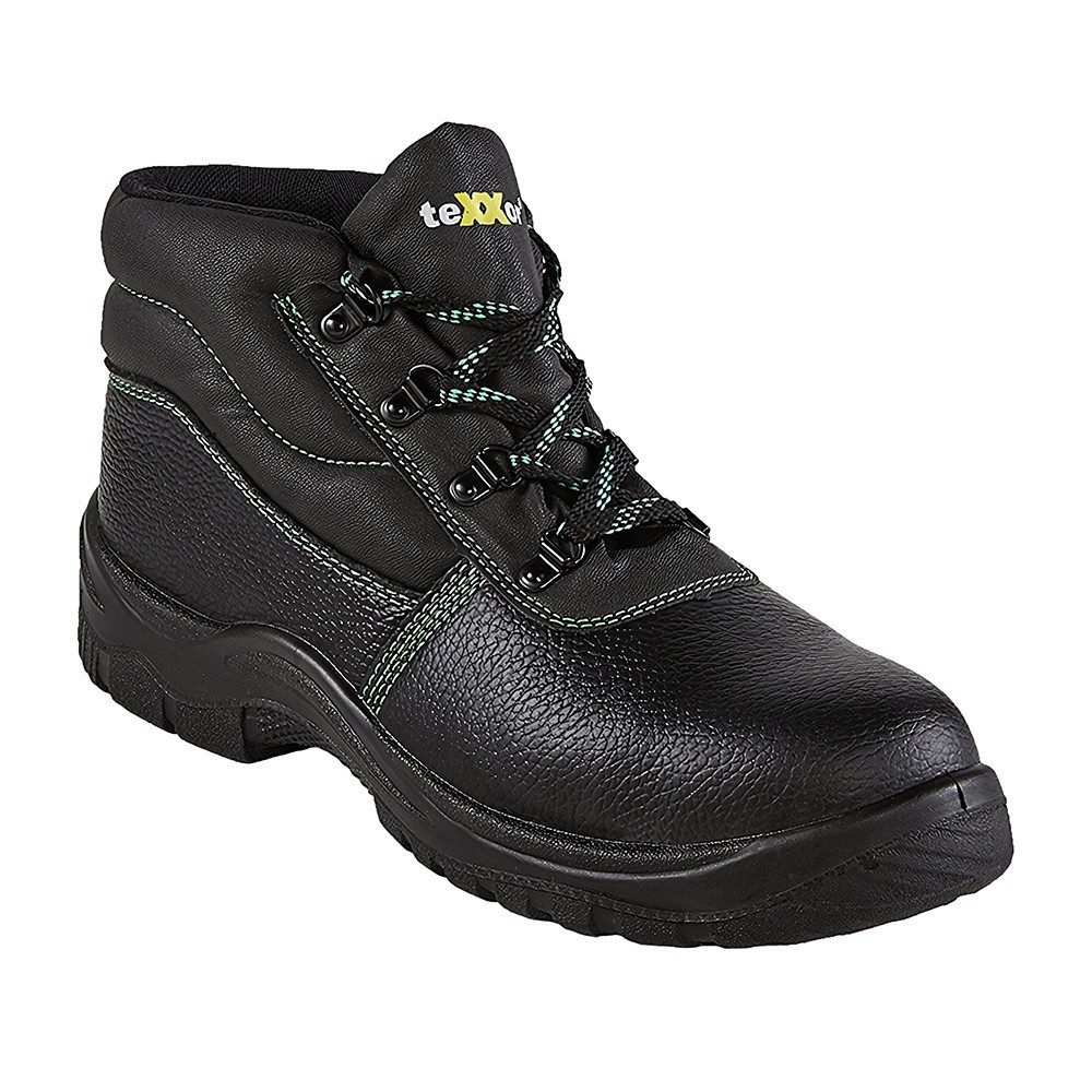 Obermaterial: genarbtes Rindleder (schwarz), grüne Nähte, gepolsterte Faltlasche, Metallschnürösen (schwarz) Futter: atmungsaktives Textil-Funktionsfutter (schwarz) Sohle: 2-Dichten PU-Sohle (schwarz) Zehenschutzkappe: Stahl Durchtritthemmung: Stahl Fußbett: ganzflächige Einlegesohle