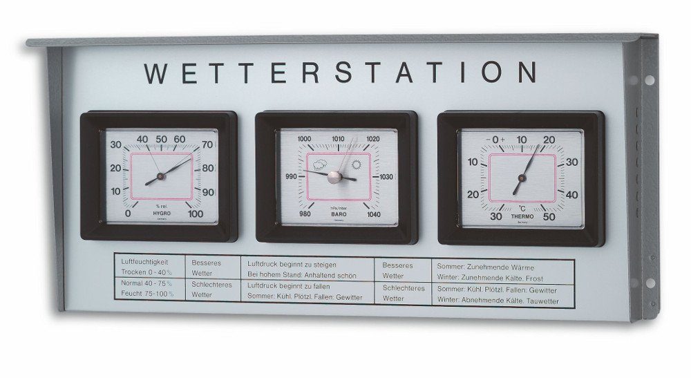 Diese äußerst stabile Wetterstation ist hauptsächlich für den Einsatz im Freien konstruiert worden. Sie besteht aus einem rostfreien Alugehäuse mit Hammerschlag Effekt in dem die sehr übersichtlichen Präzisions-Instrumente, Thermometer, Hygrometer und Barometer, eingebaut sind. Die Wetterstation kann auch in Wintergärten, Gewächshäusern oder Innenräumen aufgehängt werden und erfreut mit genauen Daten und guter Übersicht.