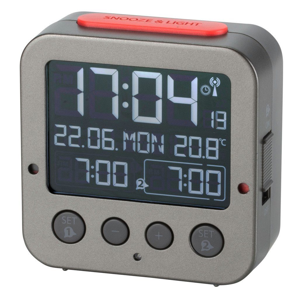 Dieser Wecker hat eine Funkuhr mit höchster Genauigkeit und manueller Einstellmöglichkeit. Er verfügt über 2 Weckalarme mit unterschiedlichen Alarmtönen und der Anzeige von Wochentag, Datum und Innentemperatur. Die Sprachauswahl für den Wochentag ist einstellbar in 6 Sprachen (Deutsch, Englisch, Italienisch, Französisch, Niederländisch und Spanisch). Er hat ein sich steigerndes Wecksignal, das zunächst zärtlich beginnt, sich aber dann zu einem lauten Weckgeräusch steigert. Über die Snooze/Light Taste kann die Hintergrundbeleuchtung für ein paar Sekunden aktiviert werden. Das Gerät verfügt über einen Lichtsensor der bei Dunkelheit automatisch die Beleuchtung aktiviert (abschaltbar).