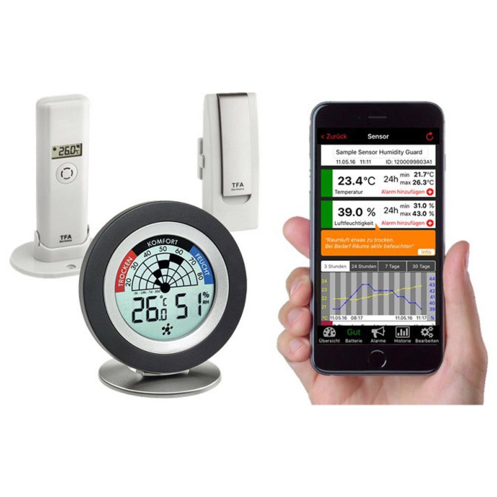 1) Das Thermo-Hygrometer informiert Sie über Temperatur und Luftfeuchtigkeit am Aufstellort, z.B. im Schlafzimmer, Kinderzimmer, Keller oder Vorratsraum. Auf der innovativen Langzeit-Radar-Anzeige erkennen Sie sofort andauernde Schimmelgefahr.