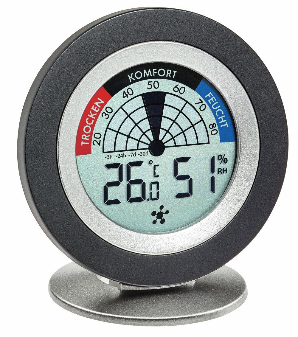 Das Thermometer-Hygrometer ist speziell zur Raum-Klima-Kontrolle entwickelt worden. Die elektronische Skala zeigt Ihnen den Zustand ihres Raumklimas an und warnt Sie vor ungesunder Raumluft.