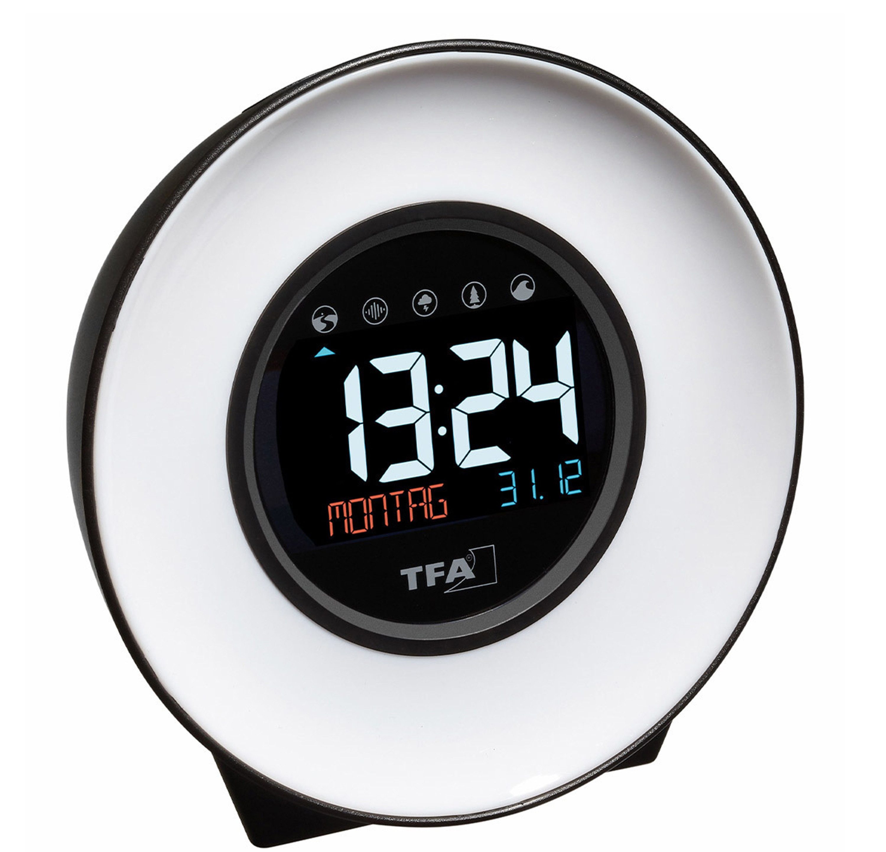 Das Stimmungslicht des MOODLIGHT Weckers schafft eine angenehme Atmosphäre in jedem Raum. Sie haben die Möglichkeit, zwischen sieben verschiedenen Farben zu wählen oder einen automatischen Farbwechsel einzustellen. Die dimmbare Lampe kann auch als Nachtlicht verwendet werden und zeigt Ihnen täglich das aktuelle Datum sowie den Wochentag in vier wählbaren Sprachen an.