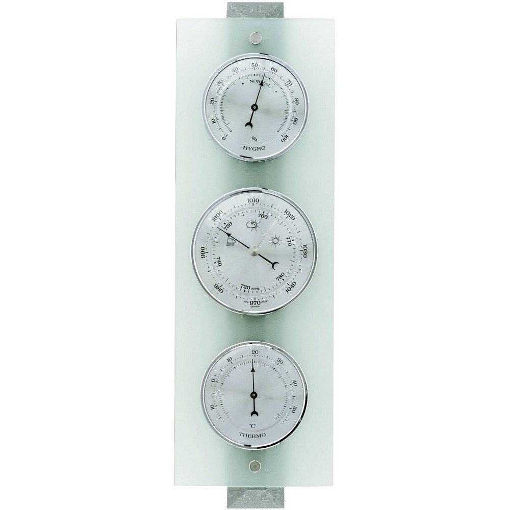 Auf einem grauen Buchensteg ist eine mattierte Glasplatte befestigt in die die großen Anzeigen eingelassen wurden. Da der Hintergrund durch das Milchglas raffiniert durchschimmert, passt sich diese Wetterstation jeder Umgebung optimal an