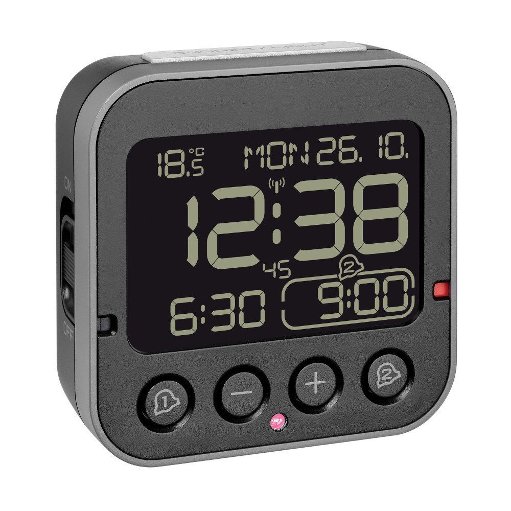 Ein Funk-Wecker mit umfangreichen Funktionen, aber ohne überflüssige Gimicks. Der Funk-Wecker Bingo 2.0 ist, wie der kleine Bruder Bingo, intuitiv und leichtgängig zu bedienen. Das große, invertierte (Negativ) Display ist noch übersichtlicher und lässt sich auch im Dunklen gut ablesen. Drückt man auf die große Taste an der Oberseite des Weckers, wird es für kurze Zeit hell beleuchtet. Wer die ganze Nacht über die Uhrzeit erkennen möchte, kann auch eine dezente und sparsame Nachtbeleuchtung auswählen, die sich über den integrierten Lichtsensor automatisch ein- und ausschaltet. Zwei Alarmzeiten mit verschiedenen Wecktönen lassen sich unabhängig voneinander aktivieren. Einfach nur den jeweiligen Schiebeschalter an der Seite nach oben schieben. Eine Farbmarke zeigt deutlich, ob der Wecker an ist. Lassen Sie sich sanft wecken mit einem ansteigenden Weckton oder gleich mit voller Lautstärke. Wenn Sie nicht sofort aufstehen möchten, dann nutzen Sie die Snooze-Funktion. Darüber hinaus informiert der Bingo 2.0 über den Wochentag und das Datum und misst zusätzlich die Raumtemperatur.