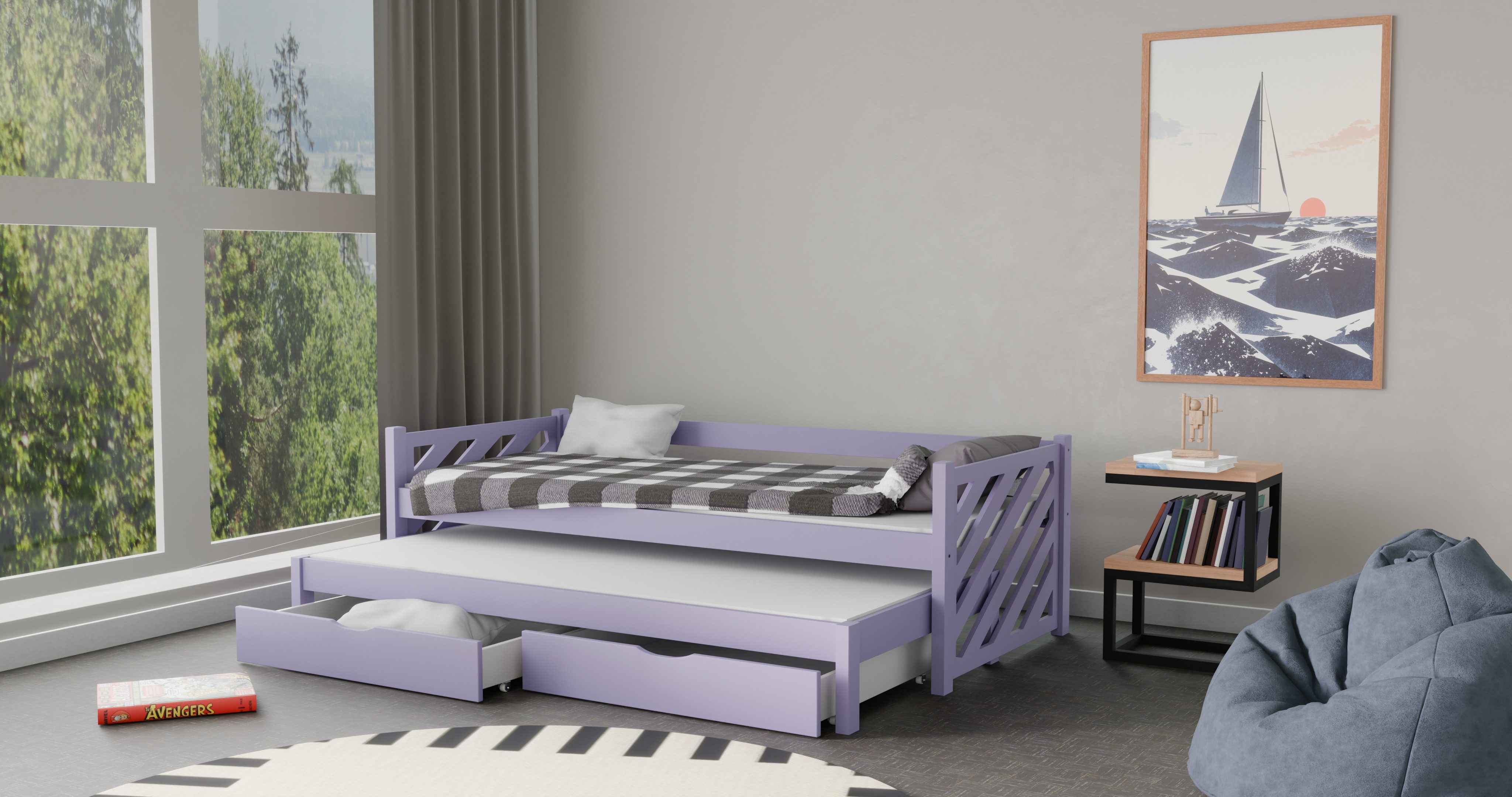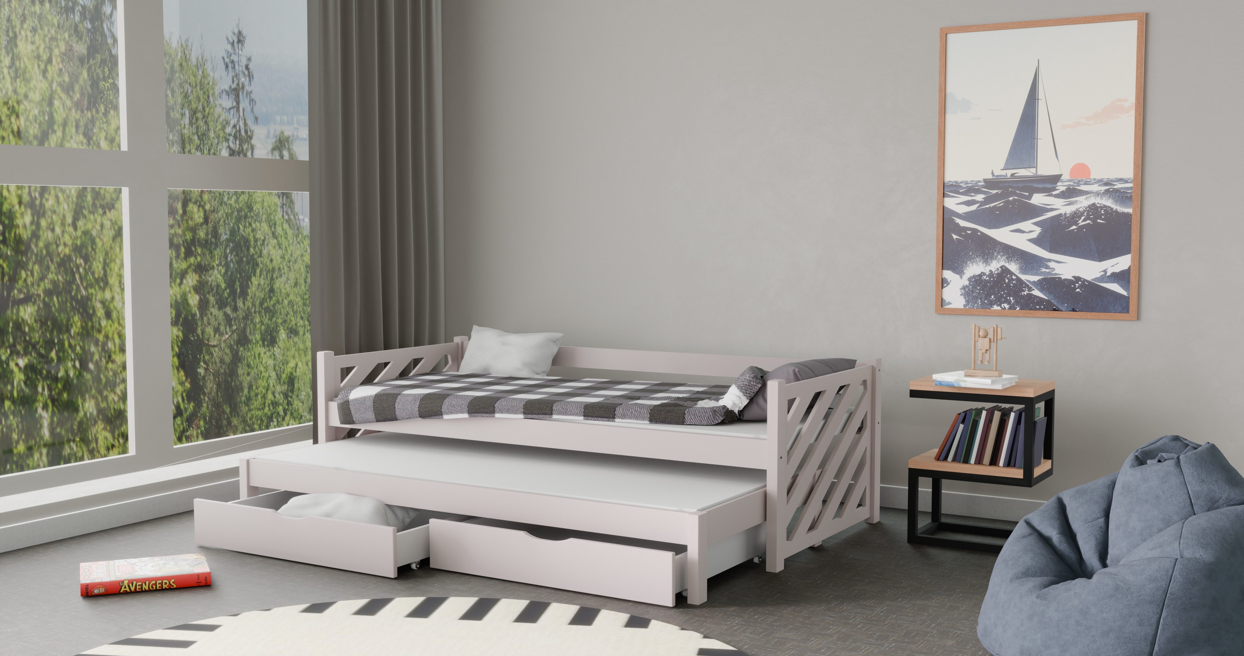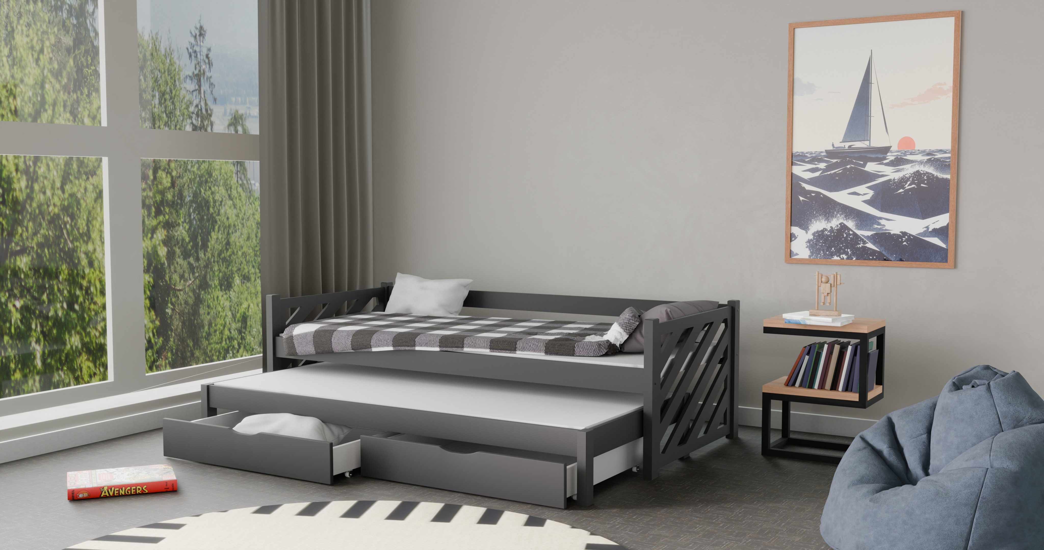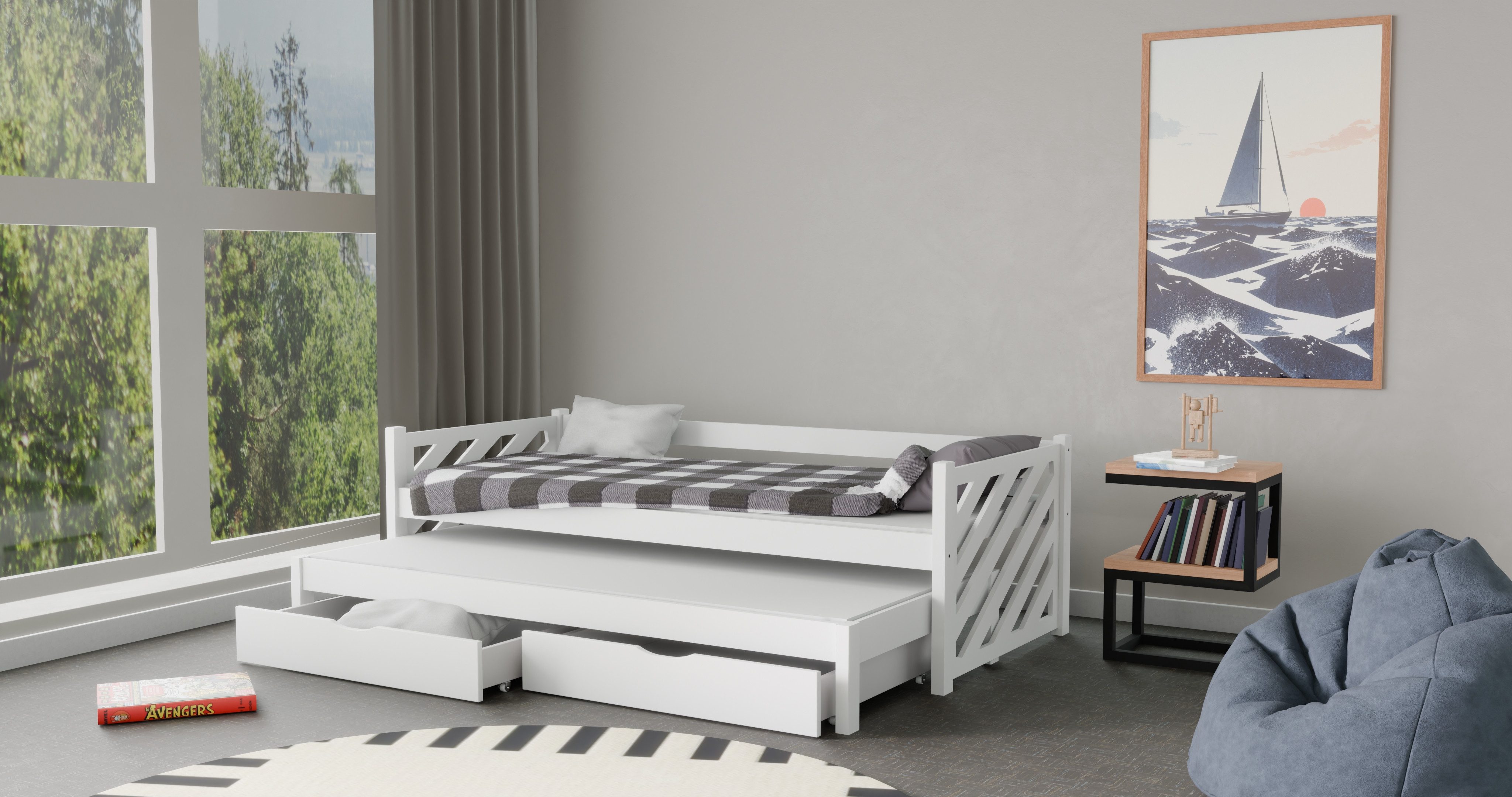 Dank des integrierten Ausziehbetts (192x90 cm) wird aus dem Einzelbett im Handumdrehen ein praktisches Doppelbett – ideal für Geschwister oder Übernachtungsgäste. Zwei große Schubladen unter dem Bett schaffen zusätzlichen Stauraum für Bettwäsche, Spielzeug oder Kleidung und helfen dabei, Ordnung im Kinderzimmer zu halten.