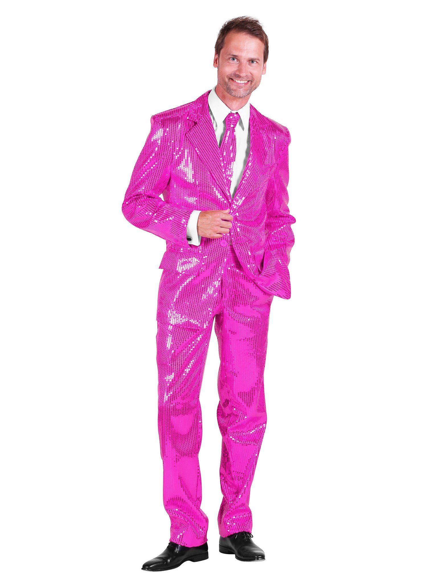 Dieser vollständig mit rosa Pailletten besetzte Party-Anzug für Herren ist ein modisches Ausrufezeichen und verwandelt Dich in eine lebende Discokugel!