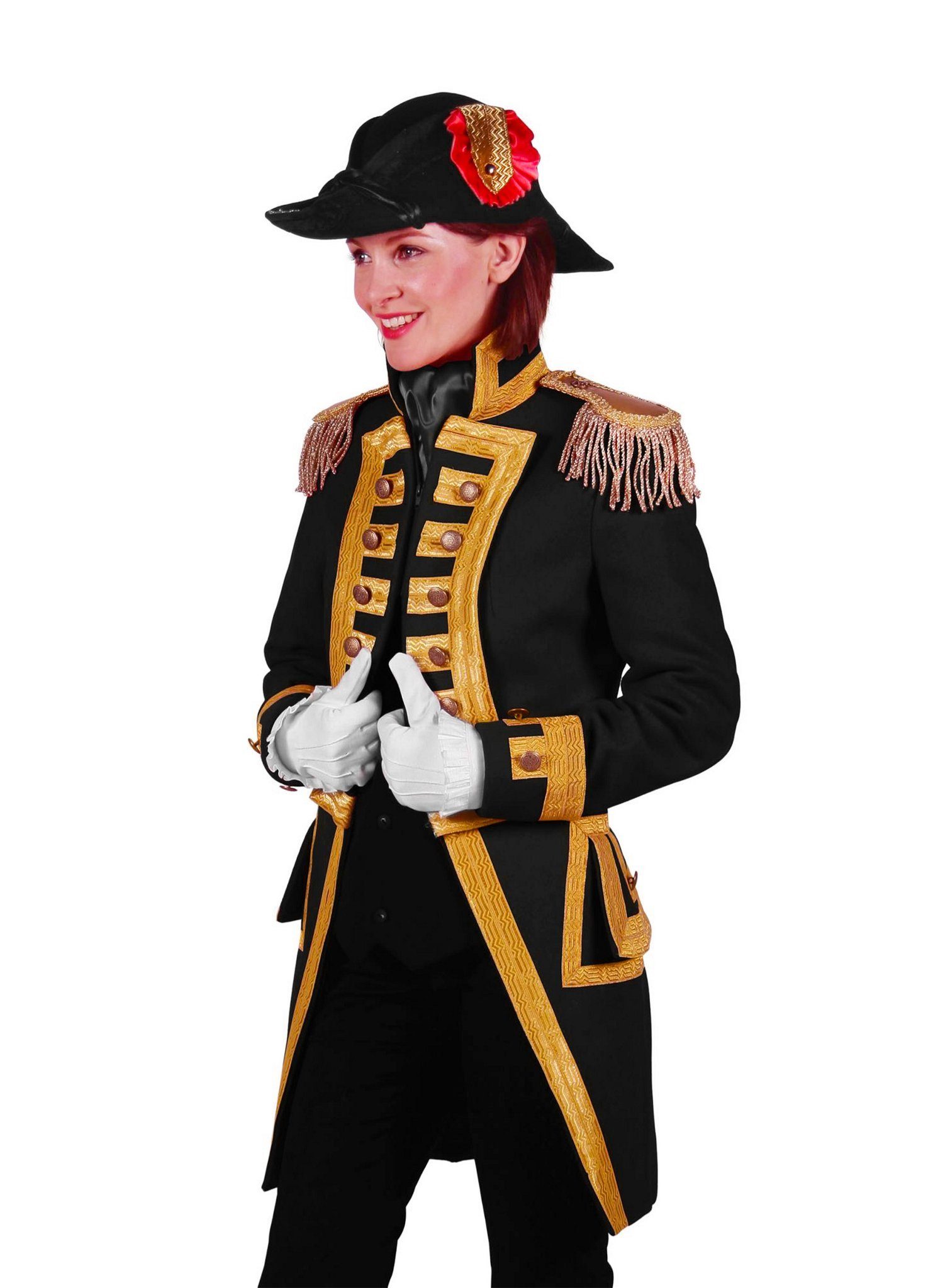 Ausstattung | - Gardeuniform für Damen schwarz einteilig- mit goldfarbenen Zierborten- mit Stehkragen- mit Epauletten- ohne sonstige Kostümteile und Accessoires |