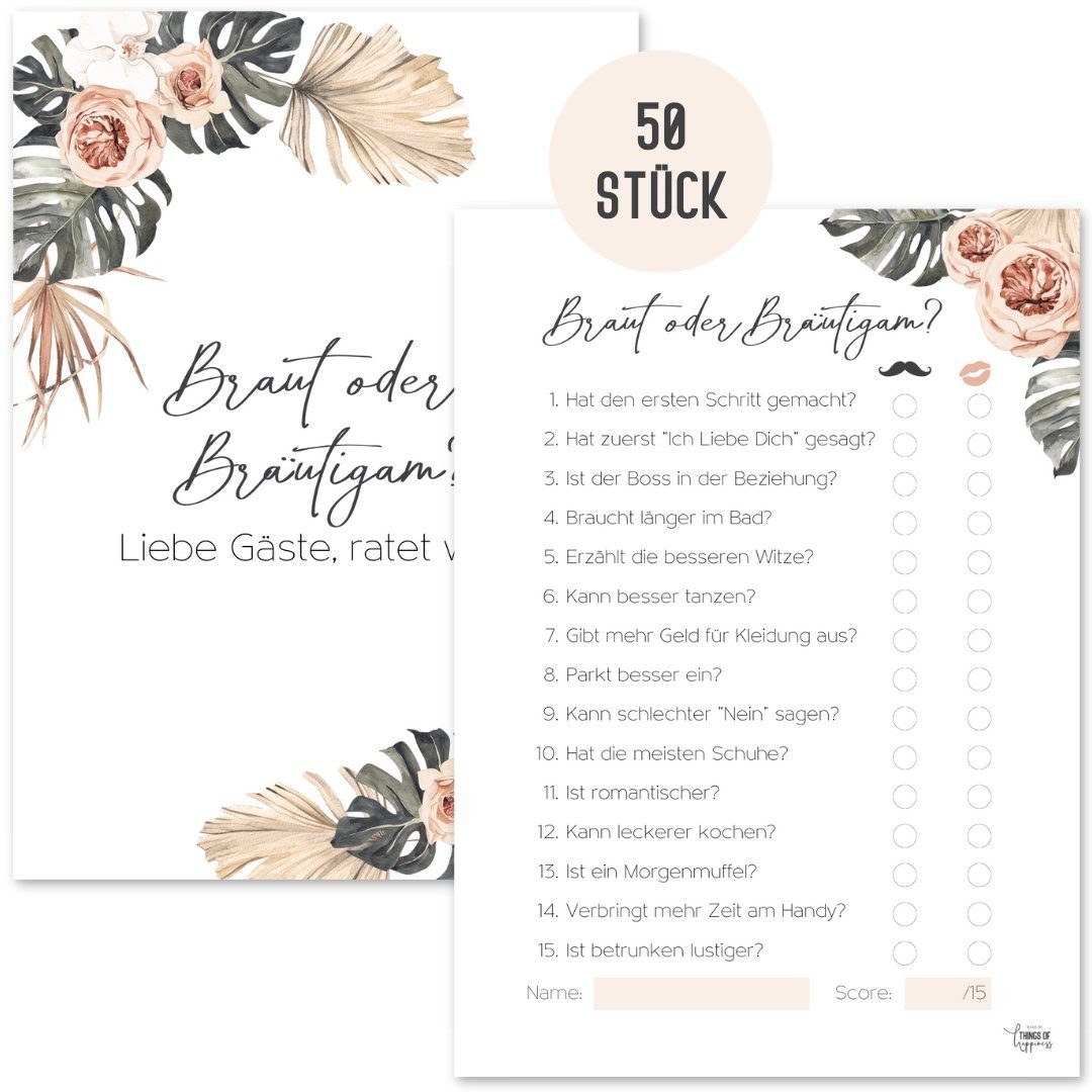 HOCHZEITSQUIZ FÜR DAS BRAUTPAAR 50 Karten zum Mitraten Die Hochzeit ist ein besonderer und unvergesslicher Tag im Leben eines Paares. Mit den liebevoll gestalteten Karten können die Gäste beim Klassiker der Hochzeitsspiele mitraten. UND SO GEHT ES 1) Verteile die Karten an die Gäste. Tipp: Wenn ihr vorab die Namen eintragt, können die Karten gleichzeitig als Namensschilder verwendet werden. 2) Die Gäste tippen, welche Feststellungen auf den Karten mehr auf die Braut oder den Bräutigam zutreffen. 3) Das Brautpaar setzt sich Rücken an Rücken, sodass sie einander nicht ins Gesicht schauen können. Nun werden ihnen die gleichen Fragen gestellt. 4) Mit Hilfe von einem Schild mit "Sie" oder "Er" drauf oder mit den Schuh des jeweiligen, beantwortet das Brautpaar die Fragen. 5) Wer den höchsten Score hat kennt das Brautpaar am besten. Es gibt weitere Methoden, wie das Spiel gestaltet werden kann. MADE WITH LOVE Als junges Frauen-Gründerteam legen viel Wert auf hochwertige Materialien und haben die Ballonkarten mit viel Liebe designed. Solltest Du dennoch mal nicht zufrieden sein, finden wir eine Lösung!