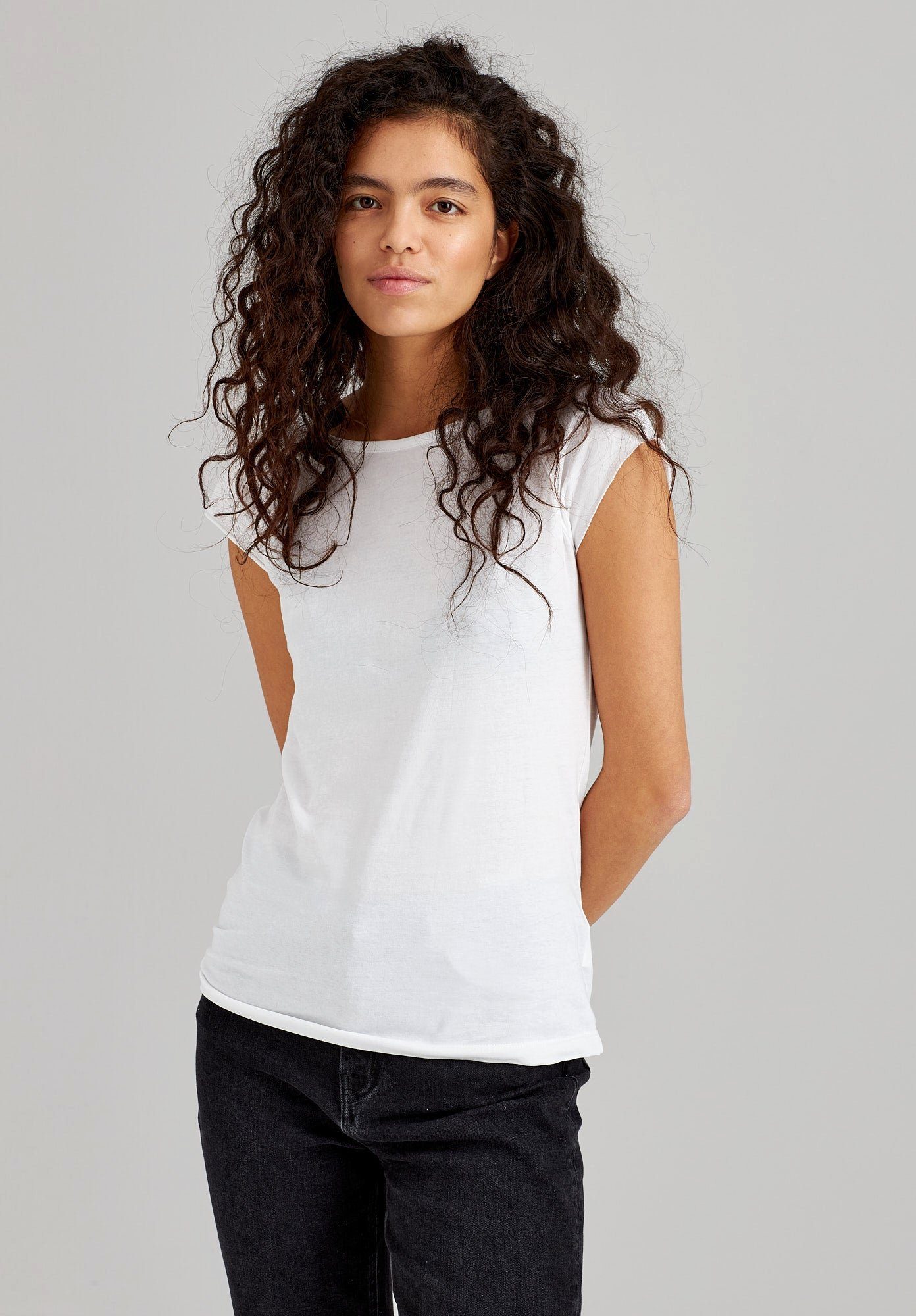 Cap Sleeve T-Shirt aus hochwertigem Biobaumwolljersey, mit ovalem Ausschnitt, angenehmer Длина und ungesäumten Ärmeln. Clean, lässig und vielfältig kombinierbar. Ein absolutes Lieblings-T-Shirt.