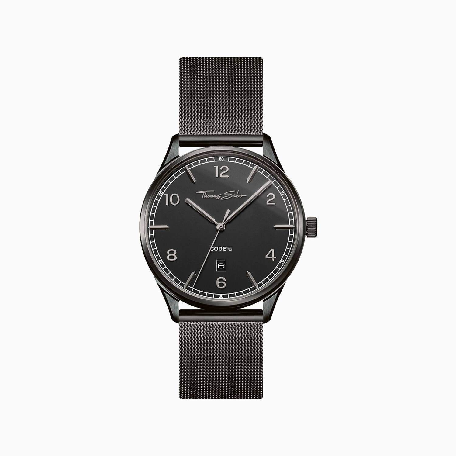 Das Modell zeichnet sich durch die einprägsame THOMAS SABO Ästhetik und seinen spannenden Mix aus Moderne und Einflüssen der traditionellen Uhrmacherkunst aus. Die Retro-Optik des schwarzen Zifferblatts, der Zeiger und Indizes ist von der klassischen Herrenuhr der 50er Jahre inspiriert und stellt heute einen neuen universellen Stilcode für sie und ihn dar. Der Kontrast zwischen der glänzend polierten, schmalen Lünette und dem matt gebürsteten Edelstahl von Gehäuse und Bandanstoß verleiht der Uhr darüber hinaus eine elegante und moderne Wirkung. Raffiniert: Das Armband der CODE TS Uhr ist einfach zu wechseln und sorgt für größtmögliche Flexibilität in puncto Styling.