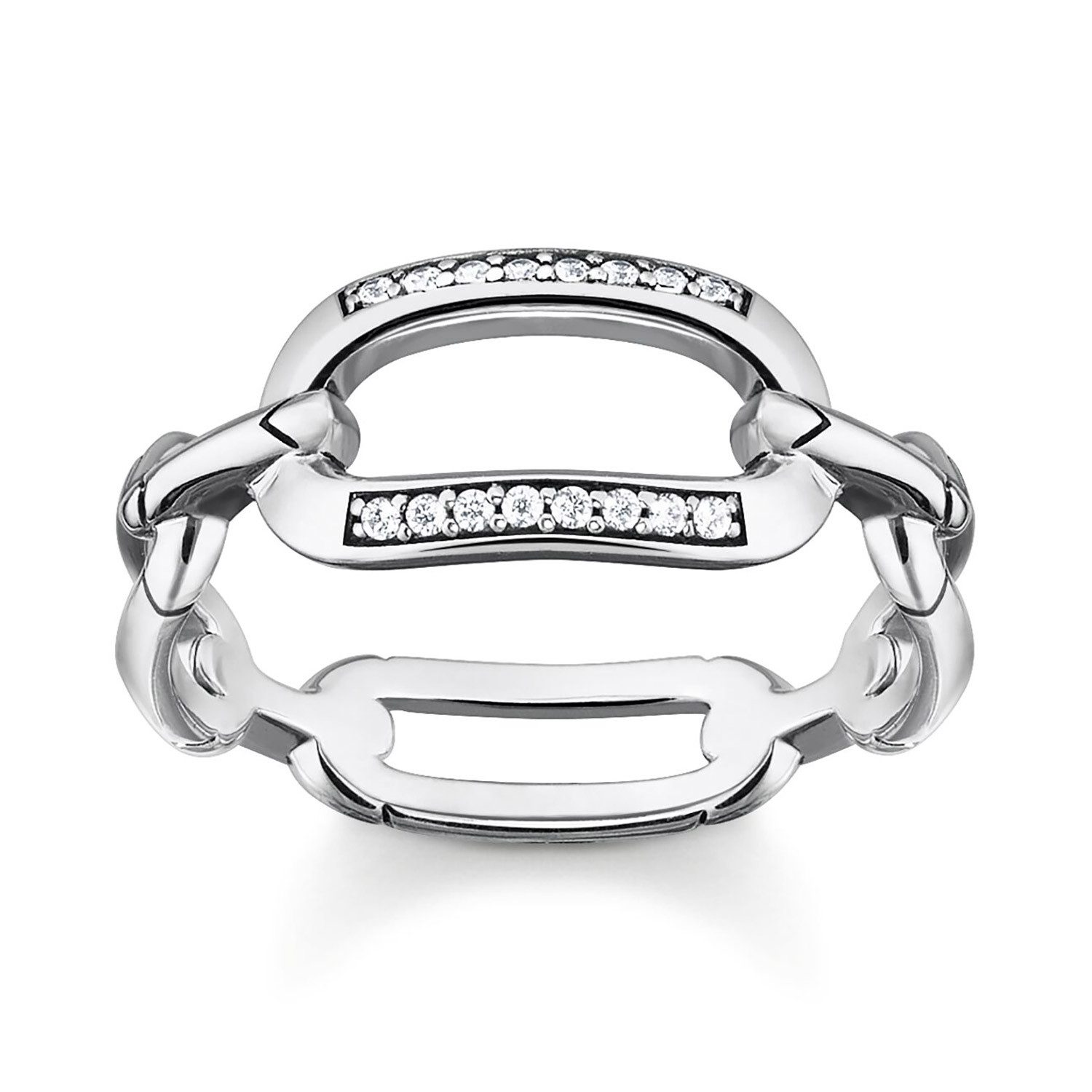 feiner Ring für Frauen aus poliertem 925 Sterlingsilber, teils geschwärzt, fest verbundene Ankerkettenglieder, eines verziert mit weißen Zirkonias, Logogravur, Breite Ringkopf 8 mm, Breite Ringschiene 4 mm