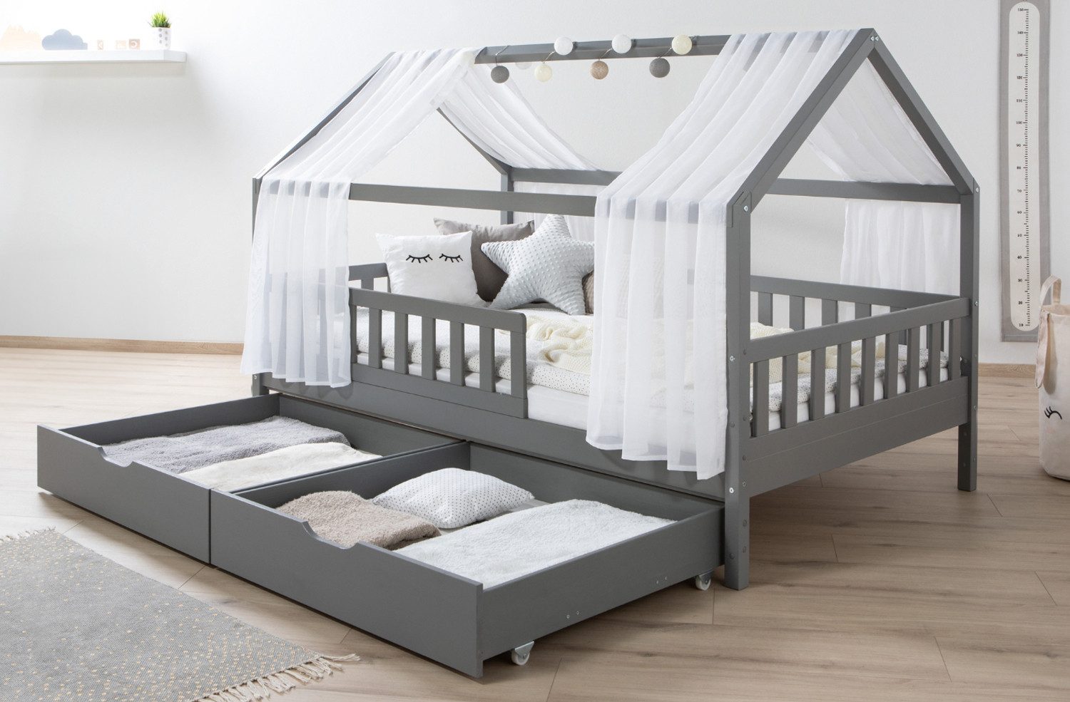Lieferumfang | Hausbett inkl. Rollrost, 2x Schubkästen und Tüllstoff (Farbe nach Wahl), Montagematerial und Montageanleitung (ohne Dekoration) |