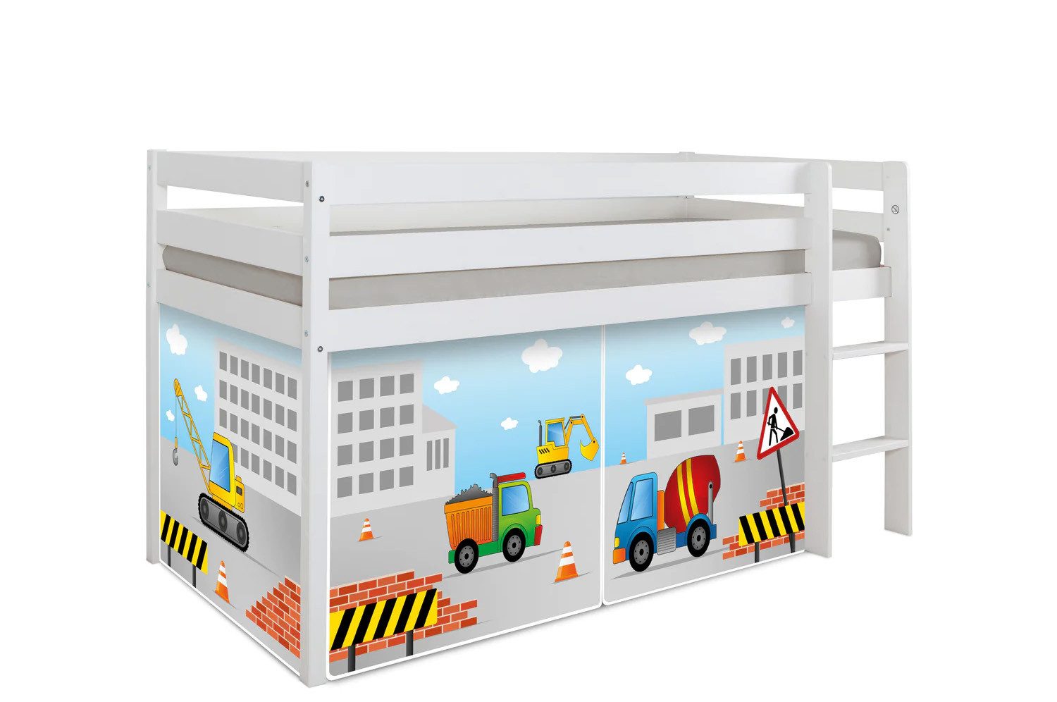 Hochbett inkl. Bettvorhang im Wunschdesign, Rollrost, Montagematerial und Montageanleitung (optional Matratze und Zubehör-Set)