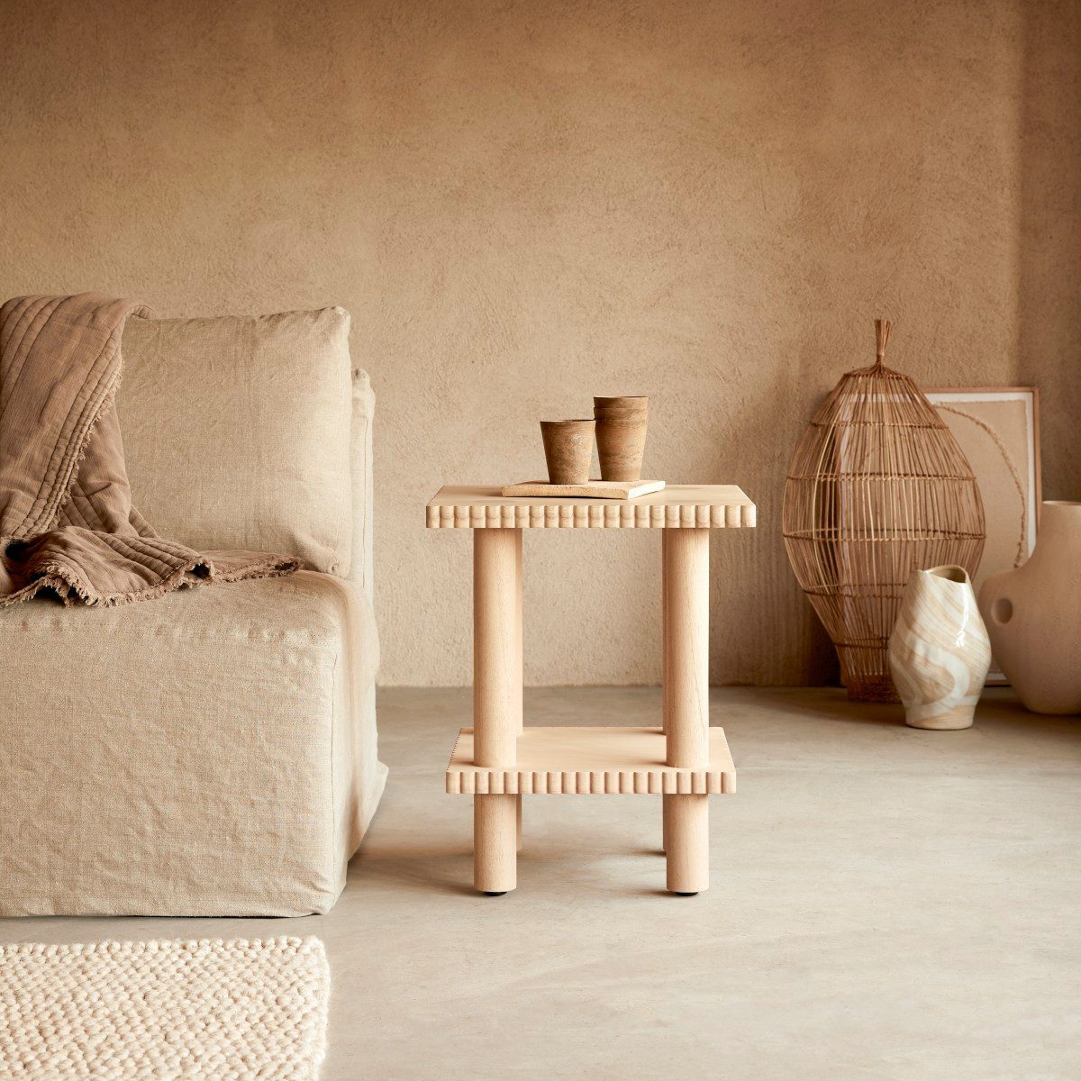 Der Nachttisch Mollie aus Mindiholz besticht durch sein kreatives Design und seine praktische Seite. Er eignet sich perfekt für eine Lampe, ein Buch oder ein Telefon. Mit seinen klaren Linien und der naturbelassenen Oberfläche verleiht er Ihrem Schlafzimmer einen eleganten und modernen Look.1 obere Ablage: B. 45 x T. 45 cm – 1 offenes Fach: H. 34 x B. 40 x T. 40 cm – Höhe der Beine: 15 cm (Nutzmaße)Produktdetails:Hauptmaterial: MindiholzMaße: H. 55 x B. 45 x T. 45 cmGewicht: 6,6 kg