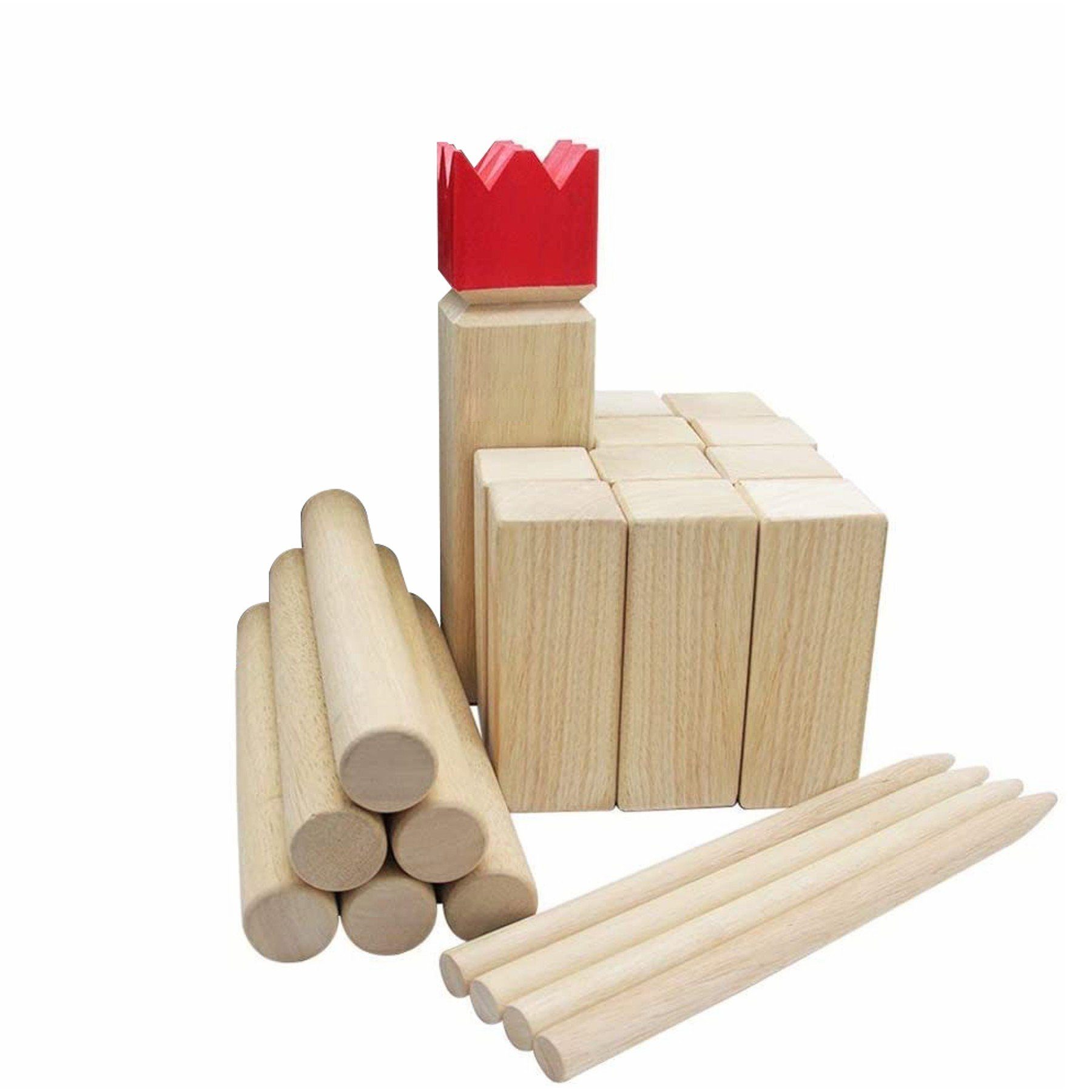Bestehend aus: 1 König: ca. 30 x 6 x 6 cm 10 Kubbs: ca. 15 x 4 x 4 cm 6 runde Wurfstöcke: ca. 30 x 2,5 cm 4 Feldmarkierungsstäbe: ca. 30 x 2 cm 1 x Tragenetz