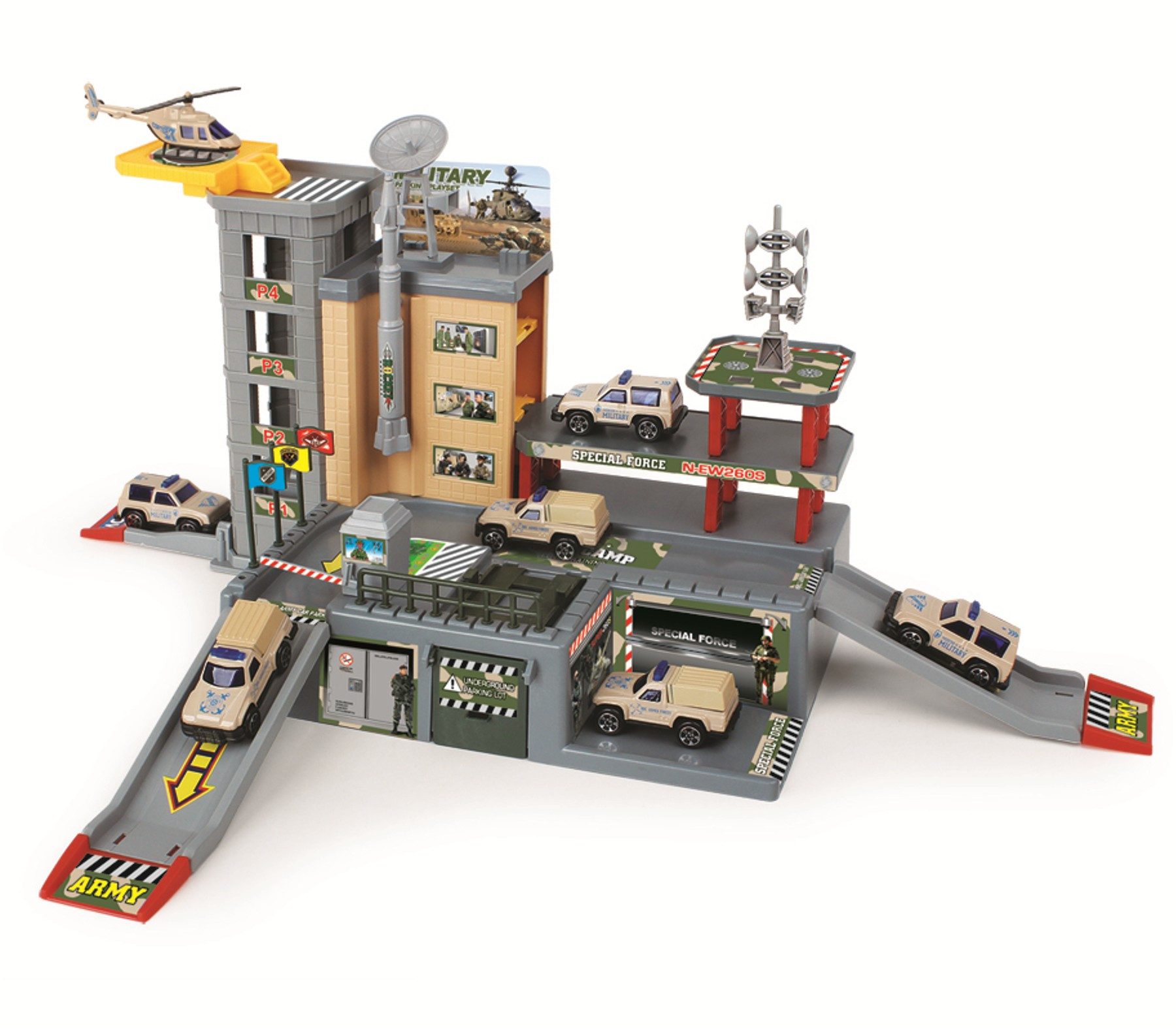 Lieferumfang | 2 Autos, Hubschrauber, Aufkleber, 3D- Spielelemente, Parkgarage |