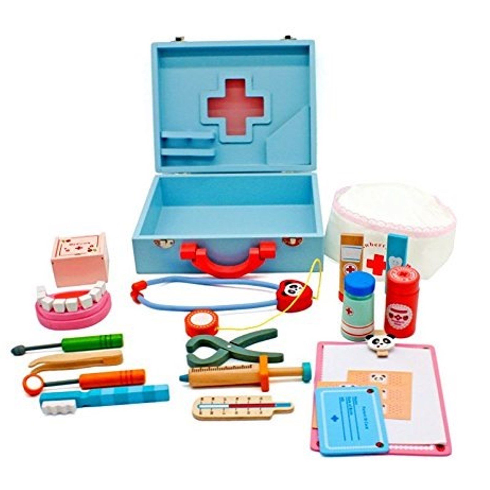 Lieferumfang | Holzkoffer, Klemmbrett mit Zetteln, Pillendose, Salbentube, Tinturfläschchen, Spiegel, Zahnmodell, Zange, Spritze, Pinzette |