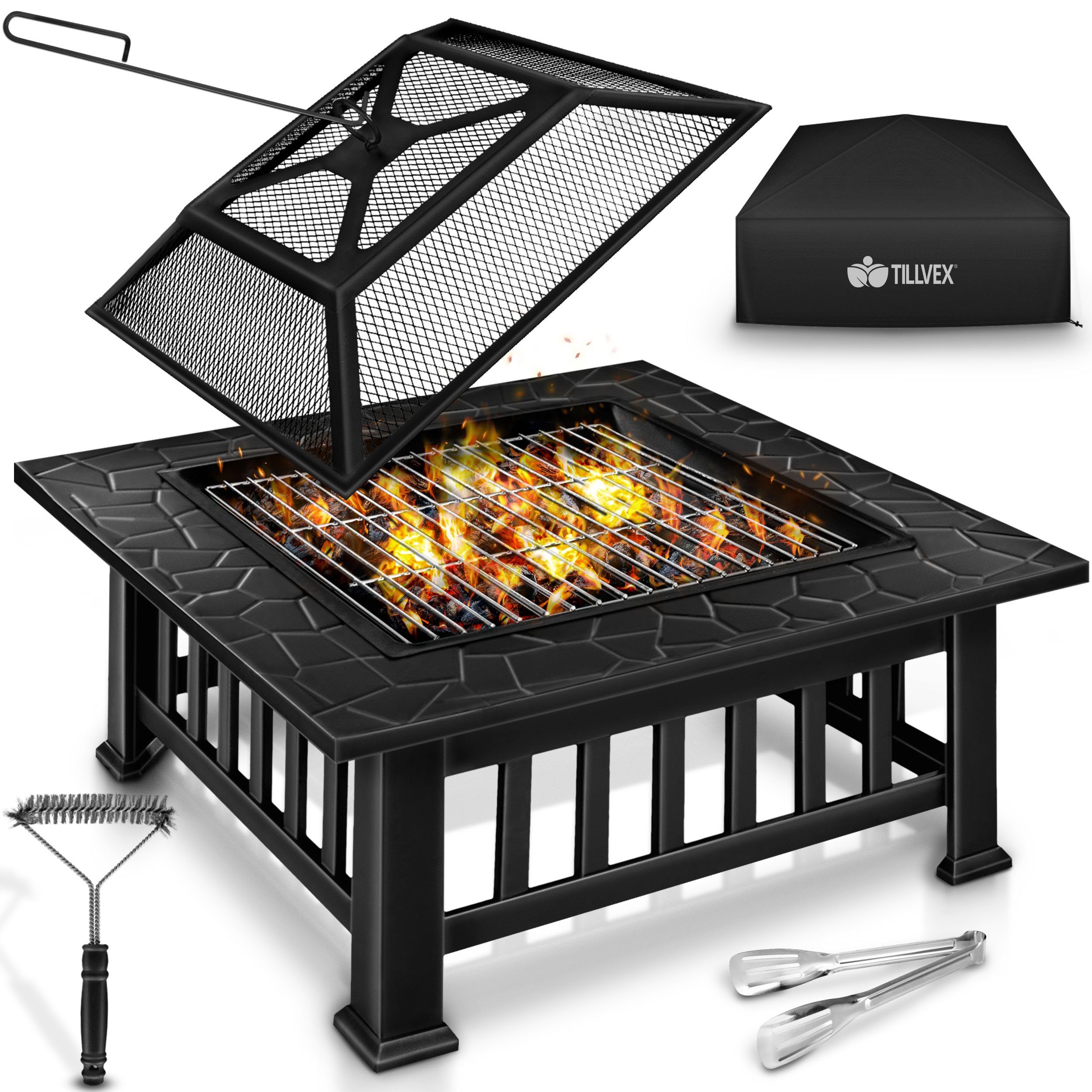 tillvex Feuerschale mit Funkenschutz & Grillrost | Feuerstelle Outdoor für den Garten | 3 in 1 BBQ Grill Feuerkorb mit Schutzhülle Schürhaken Zange & Bürste