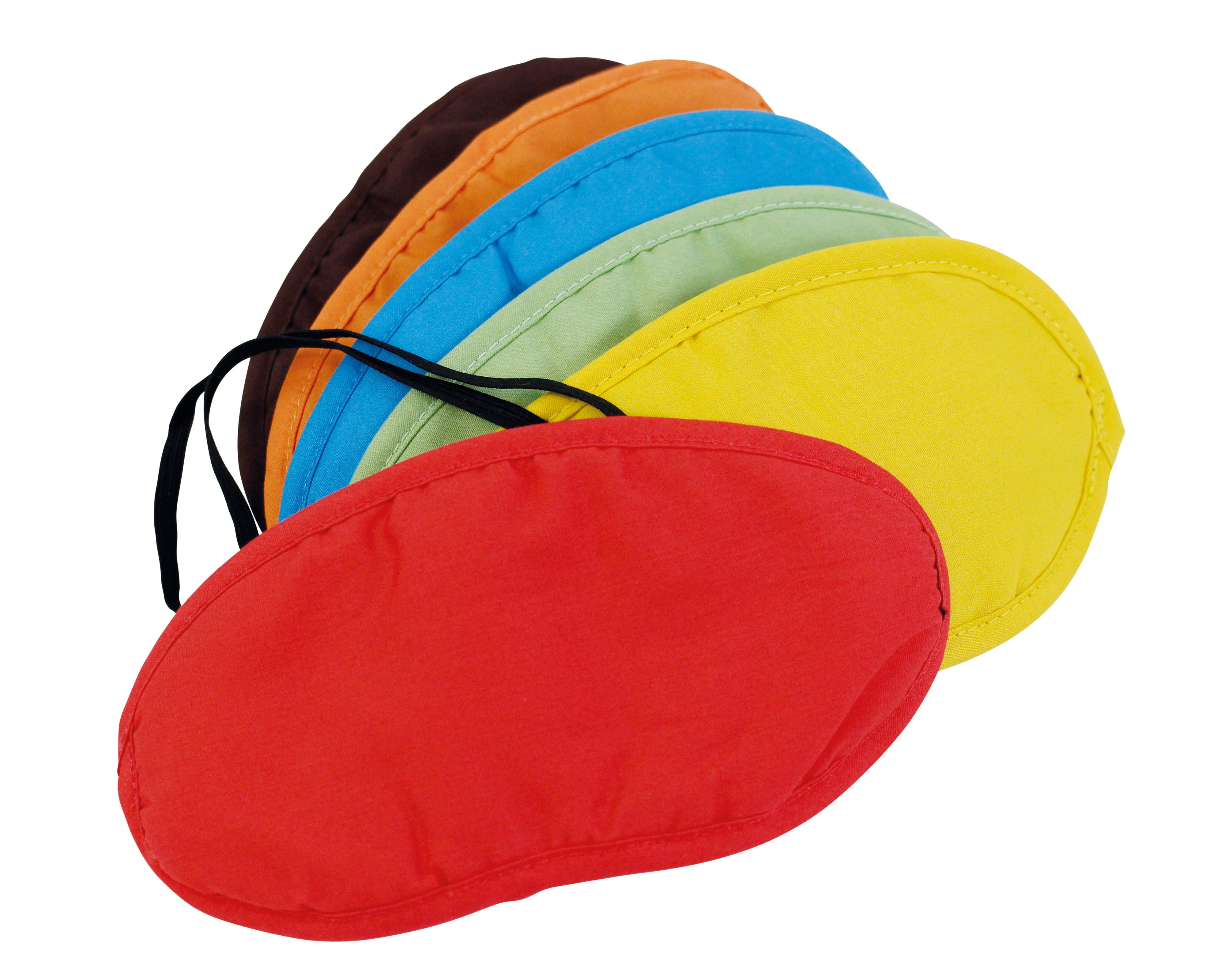 Inhalt: 6 Augenbinden für Kinder mit Gummi, 6 Farben (gelb, blau, rot, orange, grün, braun)