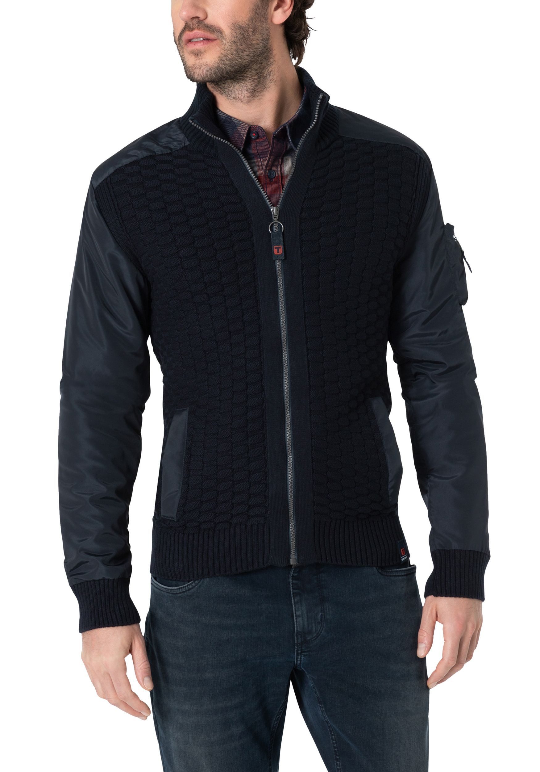 Diese Herren Strick-Bomberjacke überzeugt mit ihrer robusten, schweren Strick-Qualität und einem markanten 3D-Schachbrett-Strickmuster.